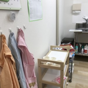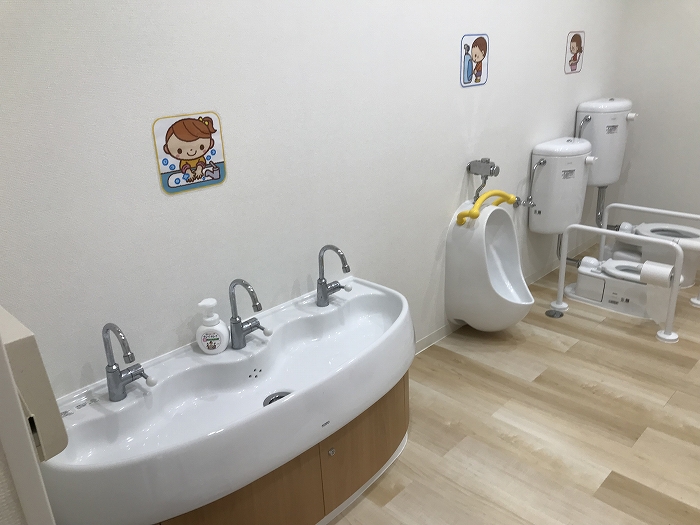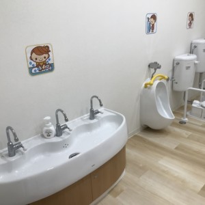 大きな窓のある開放的な園内に、子ども用に作られたトイレや洗面台、シャワーもついています。園内は冷暖房完備で、いつも快適な気温に保たれています。