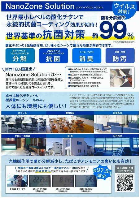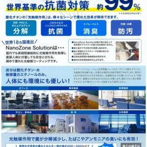 ※ナノゾーンソリューションは世界最小レベル2~3ナノの酸化チタンが、光触媒作用を繰り返し、抗菌の永続的な効果が期待できます。また、室内のLEDや蛍光灯などの光を吸収し、光触媒反応で付着したウイルス・浮遊するカビ・細菌などを安全なH2Oなどに分解します。触れても人体に無害ですので、安心して利用できます。