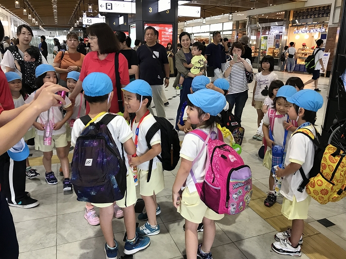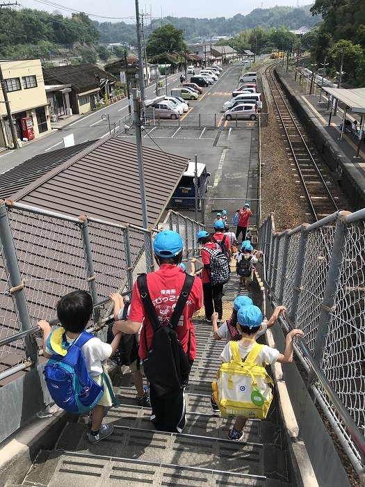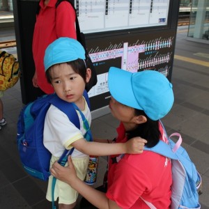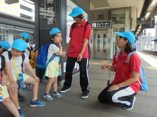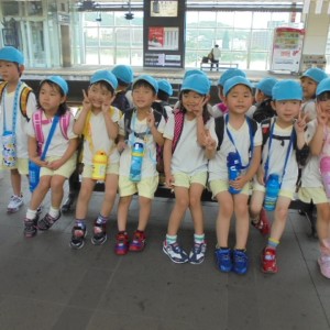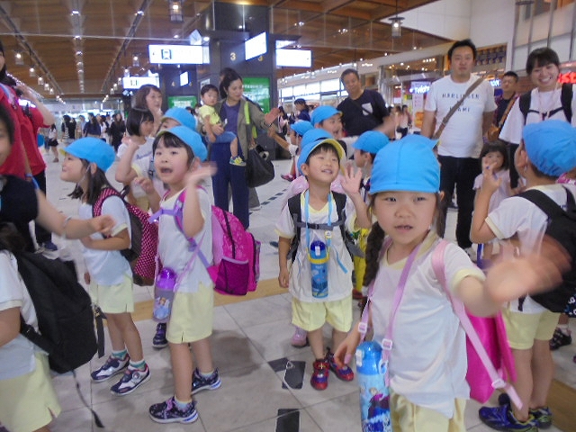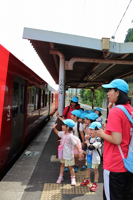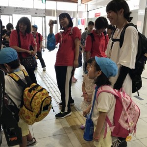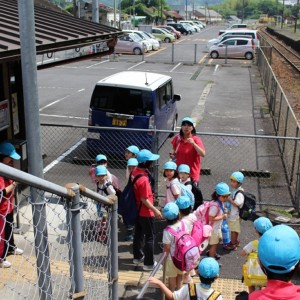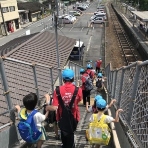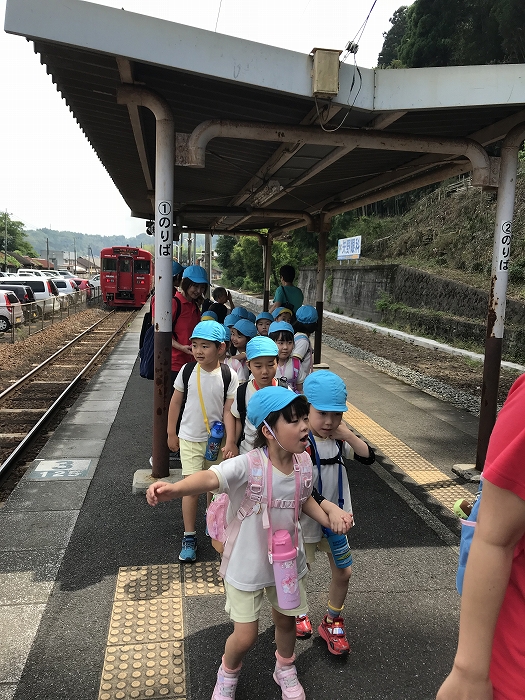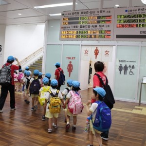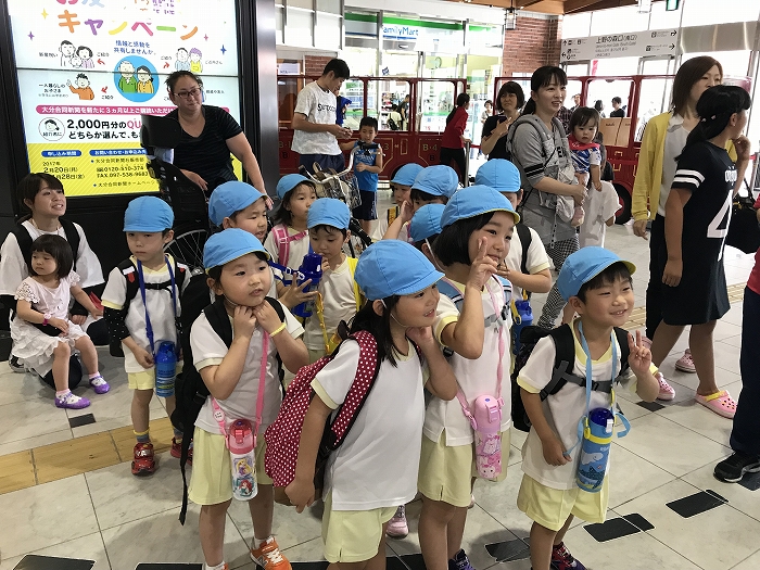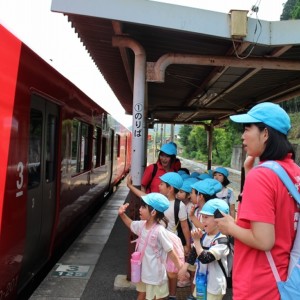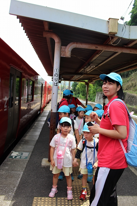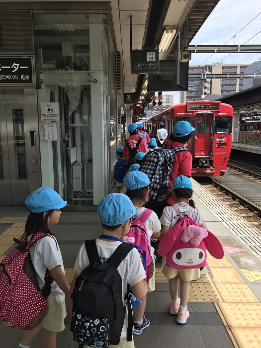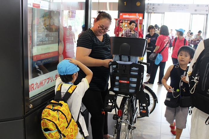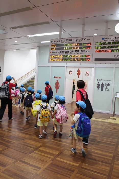 まずは、大分駅でおうちの方に見送られ、電車に乗って出発します。