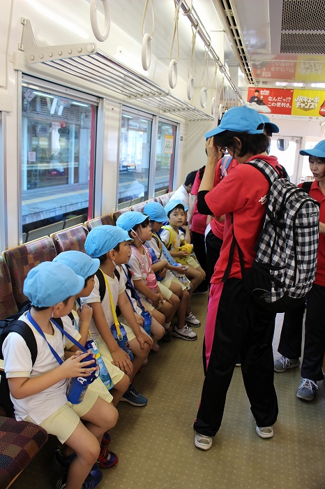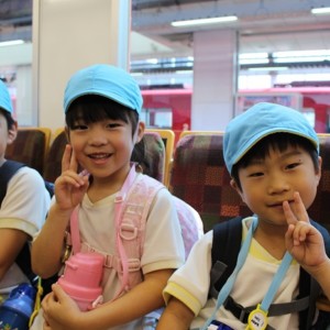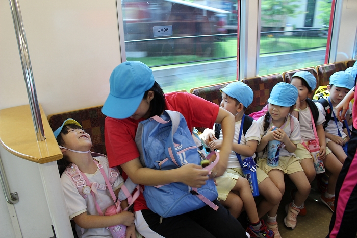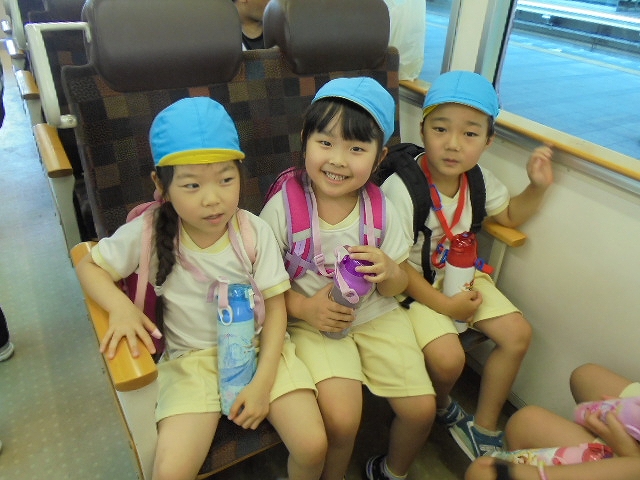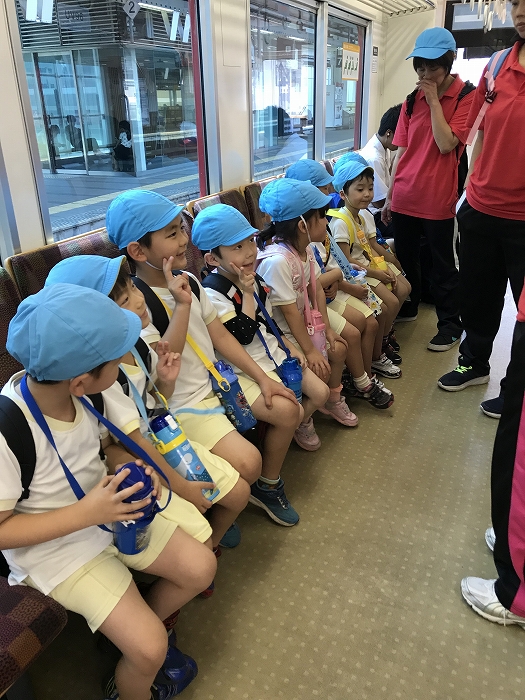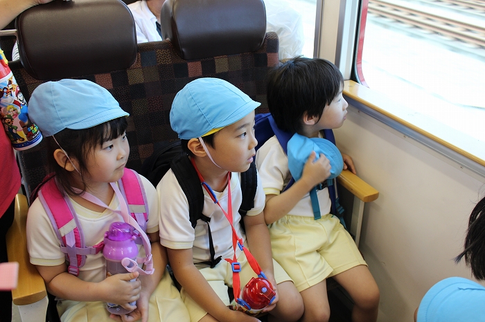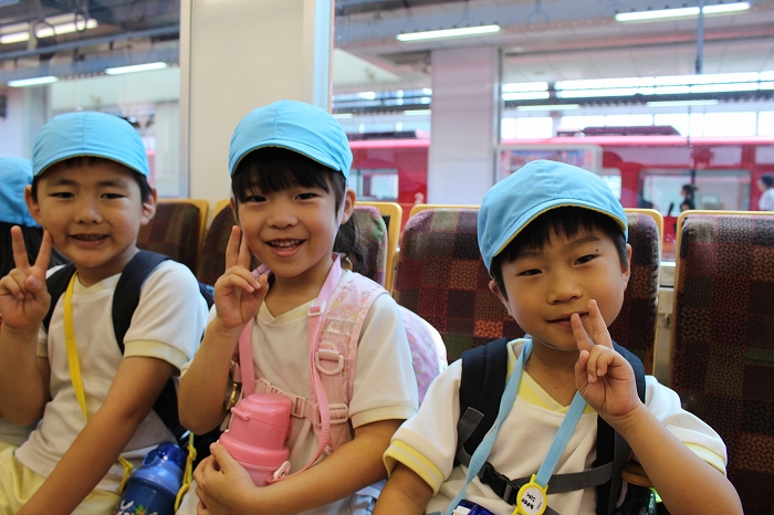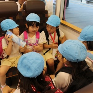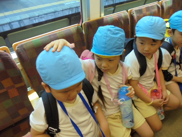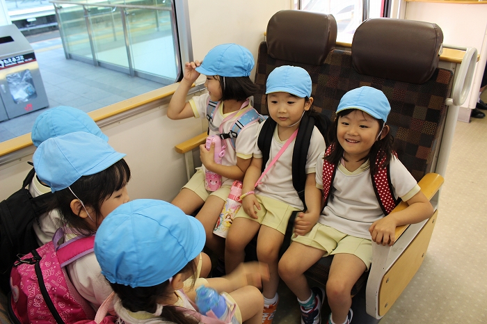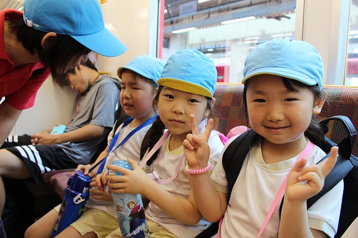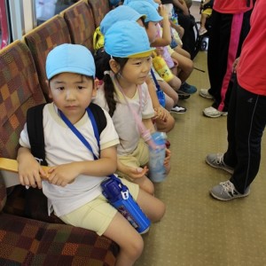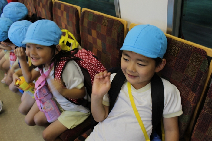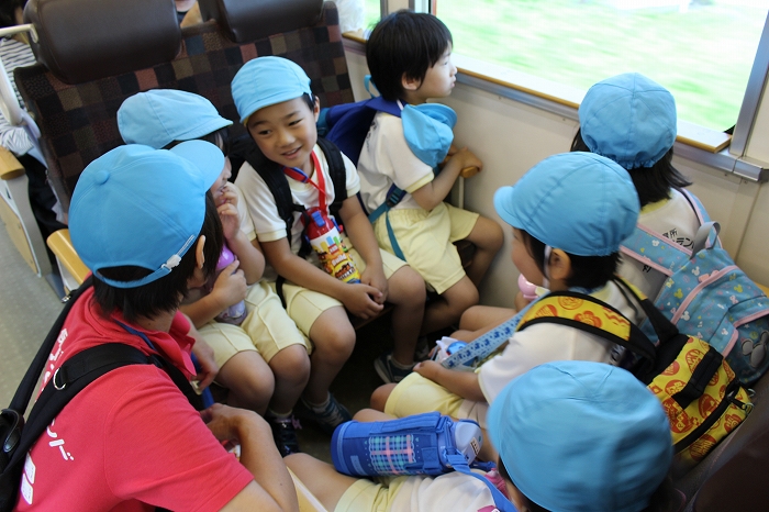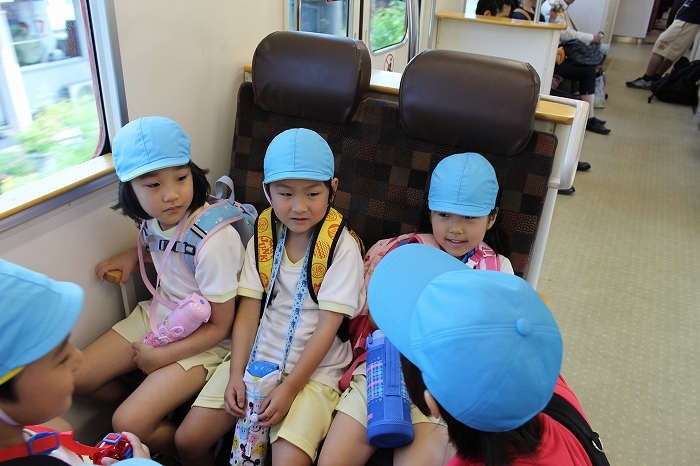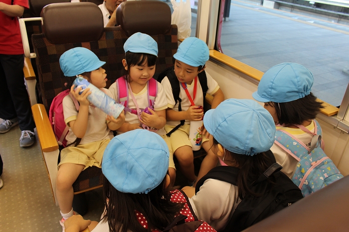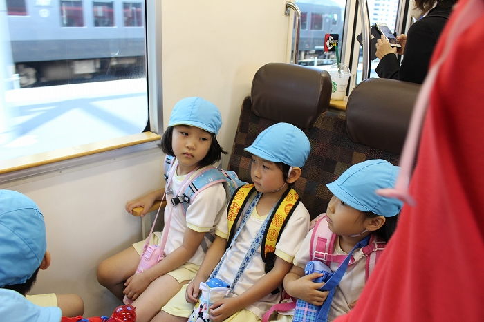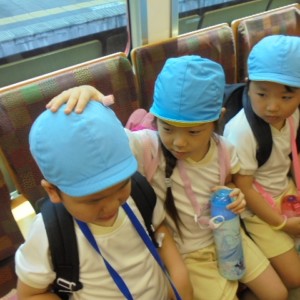 電車の中では、普段会えないおともだち。高砂園と南大分園のおともだちが交互に席に座りました。みんなちょっと最初は緊張しちゃったけど、時間が経つにつれ、慣れてきました。