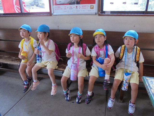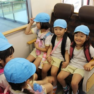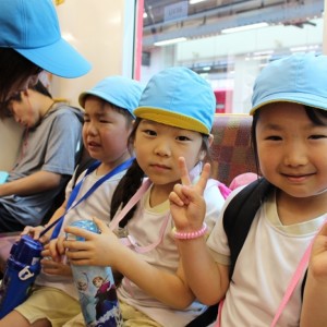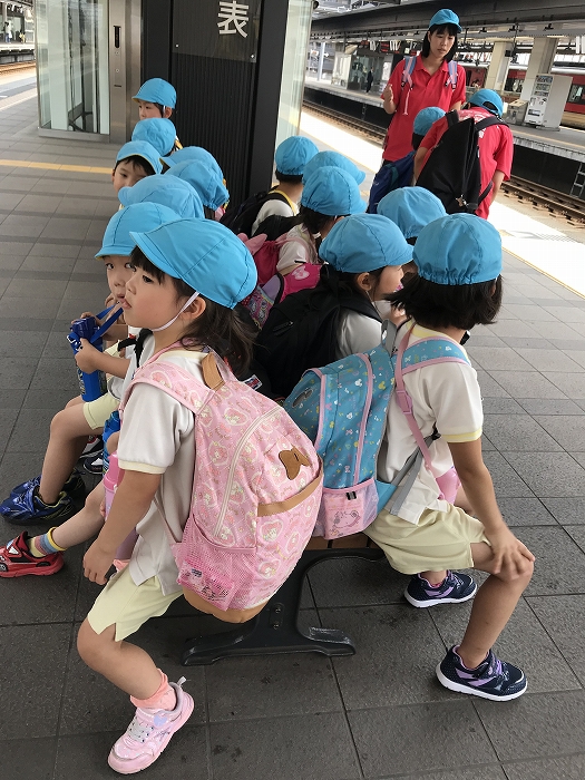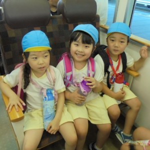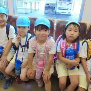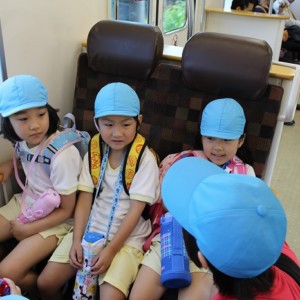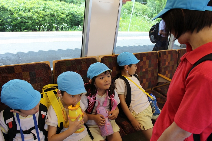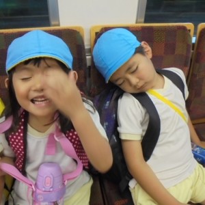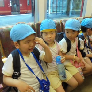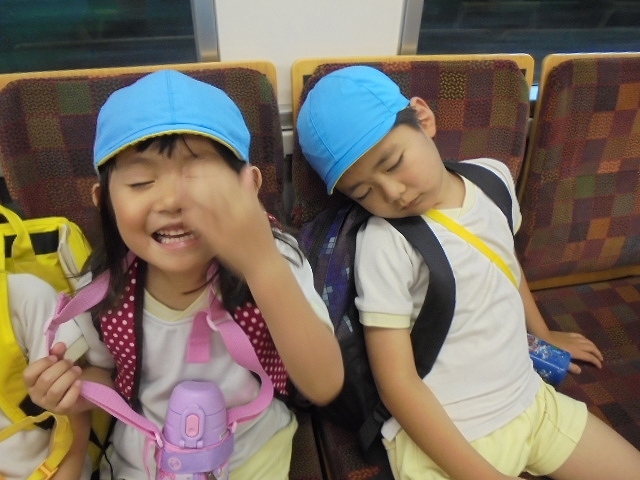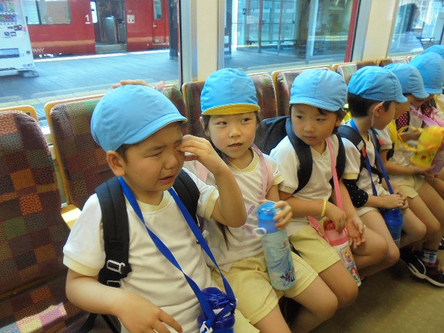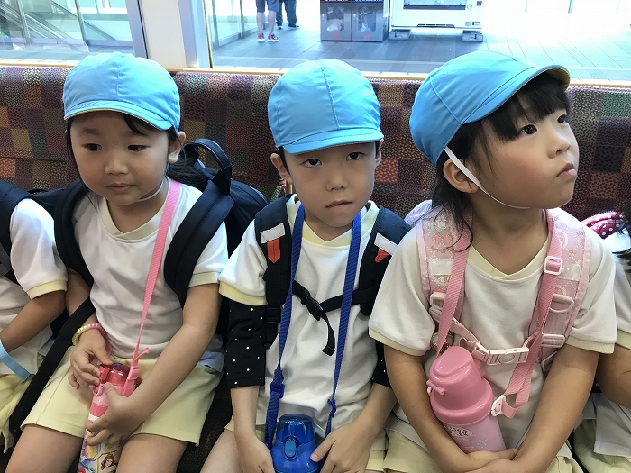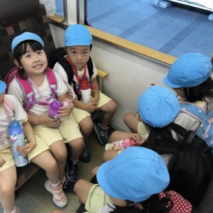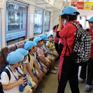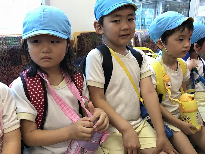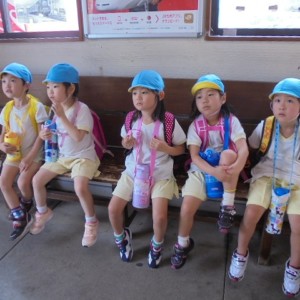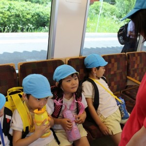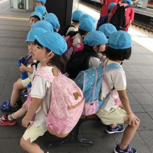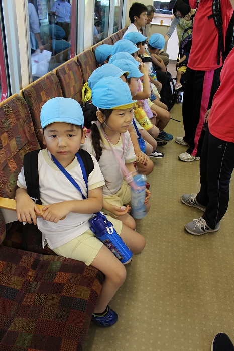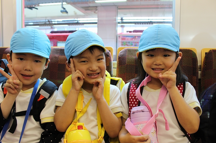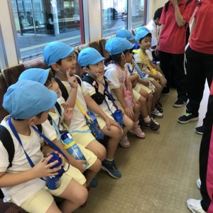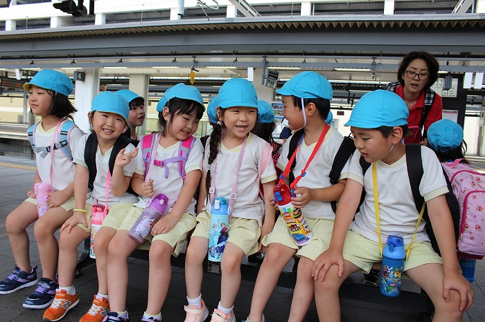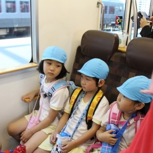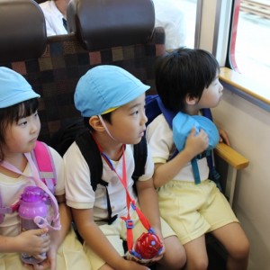 電車の中では、普段会えないおともだち。高砂園と南大分園のおともだちが交互に席に座りました。みんなちょっと最初は緊張しちゃったけど、時間が経つにつれ、慣れてきました。