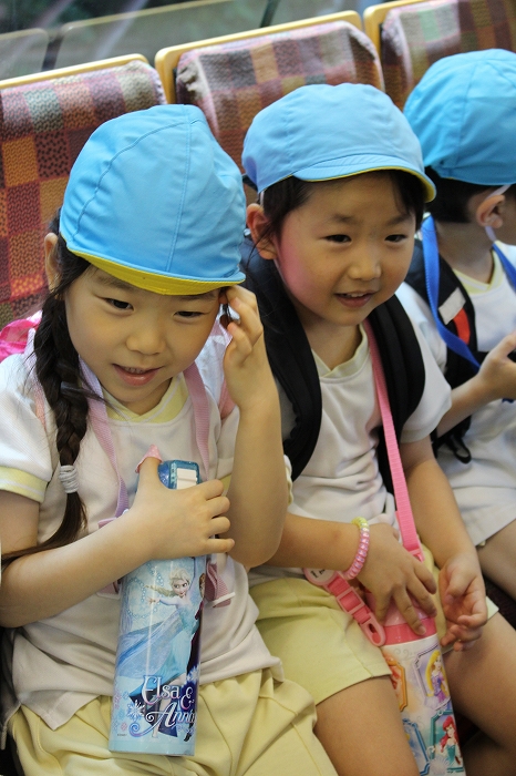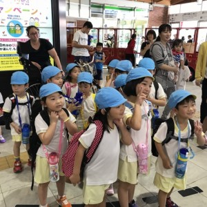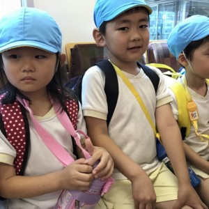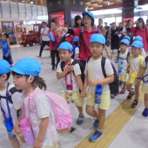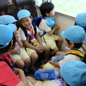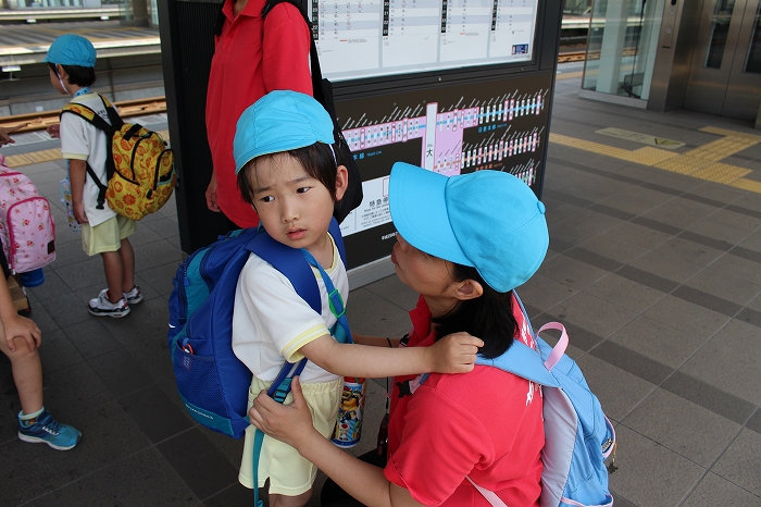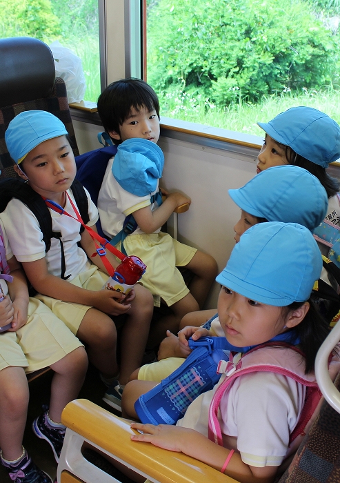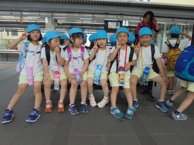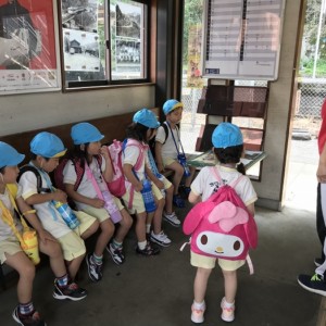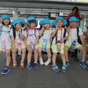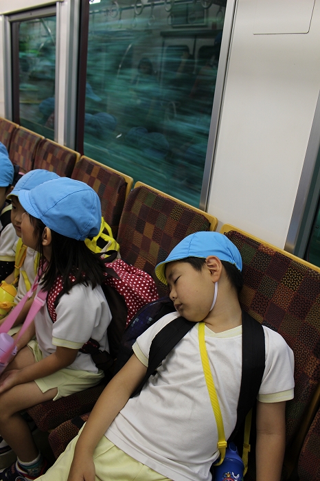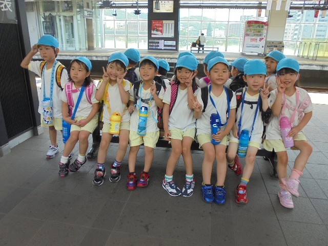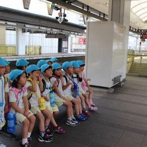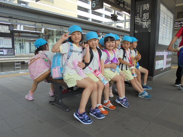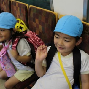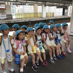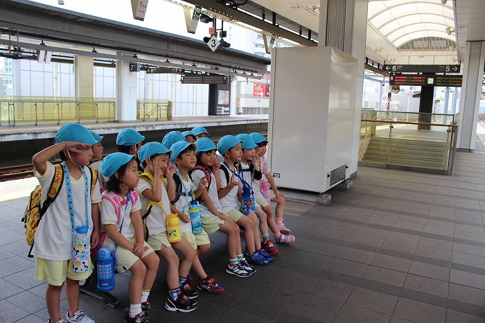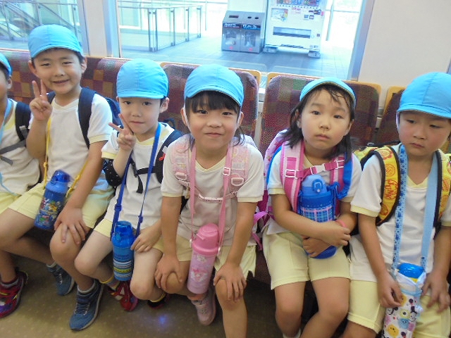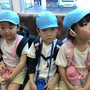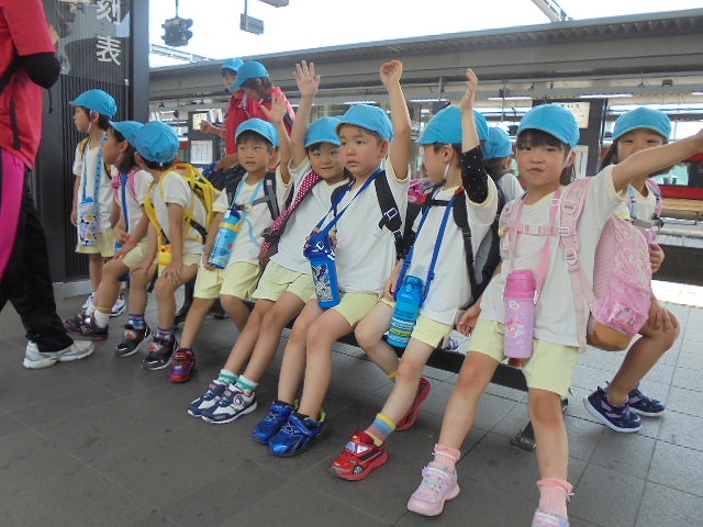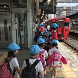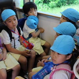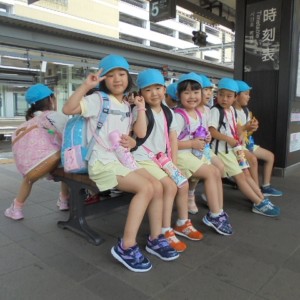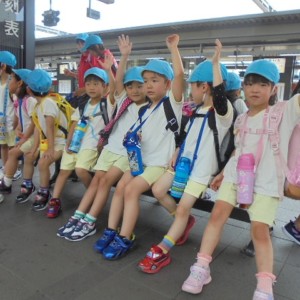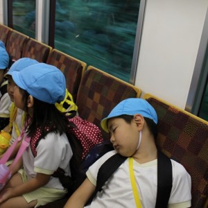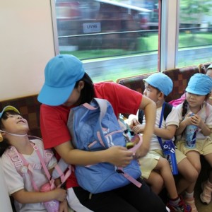 電車の中では、普段会えないおともだち。高砂園と南大分園のおともだちが交互に席に座りました。みんなちょっと最初は緊張しちゃったけど、時間が経つにつれ、慣れてきました。