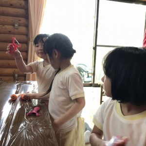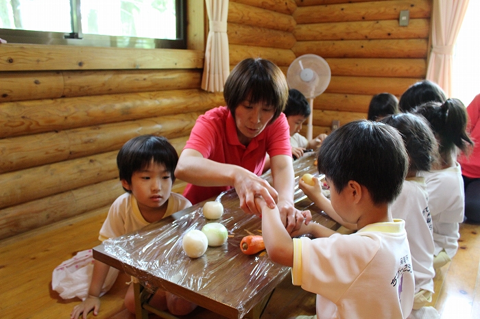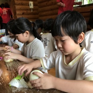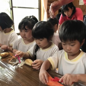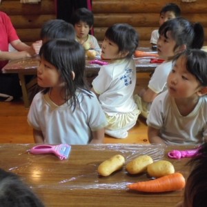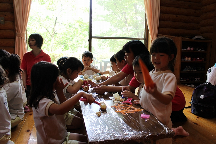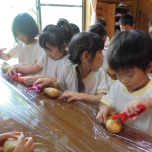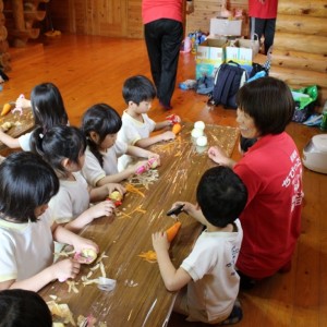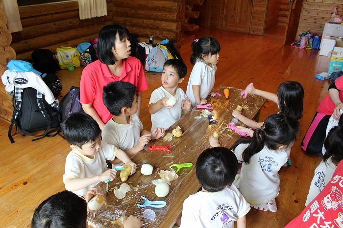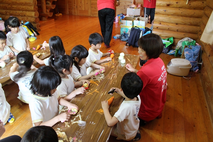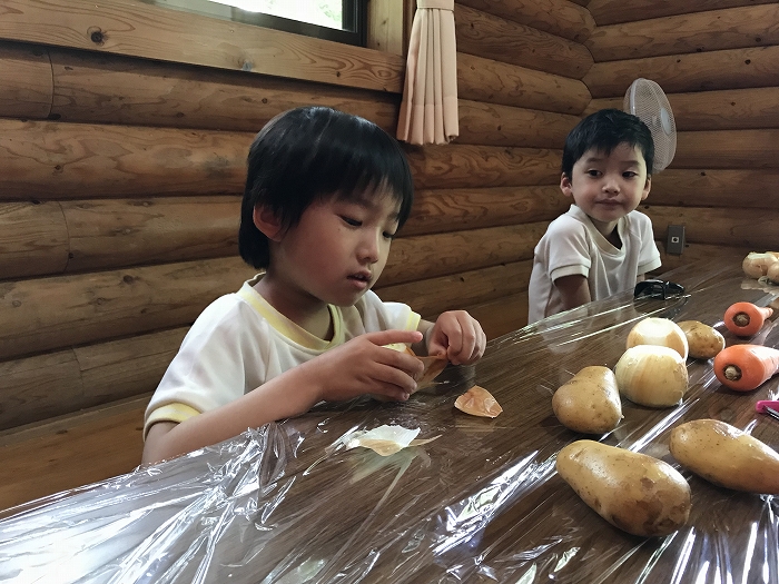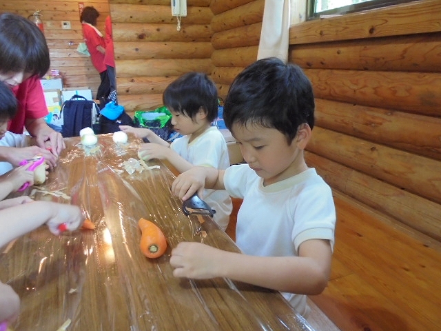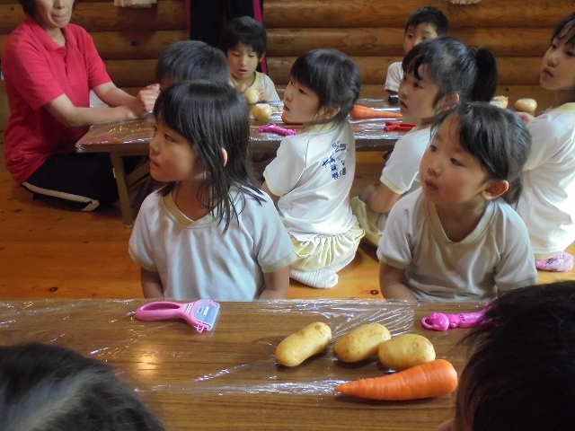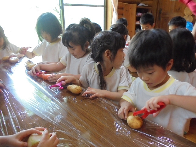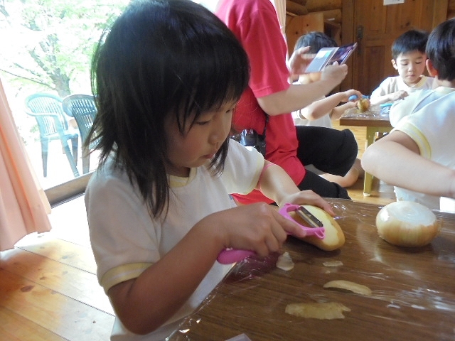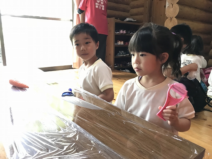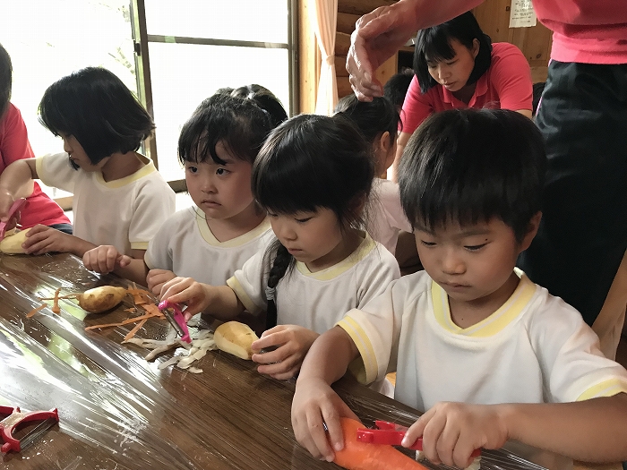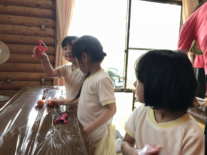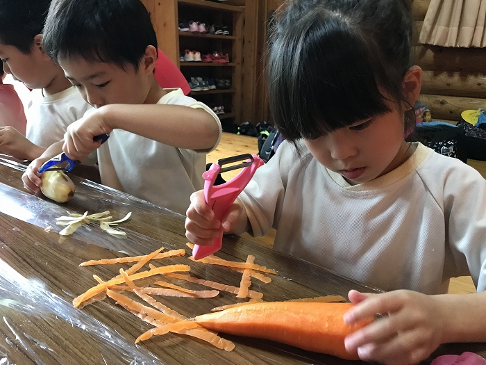 みんな、ピーラーを手に、いっしょうけんめい野菜の皮をむいていました。