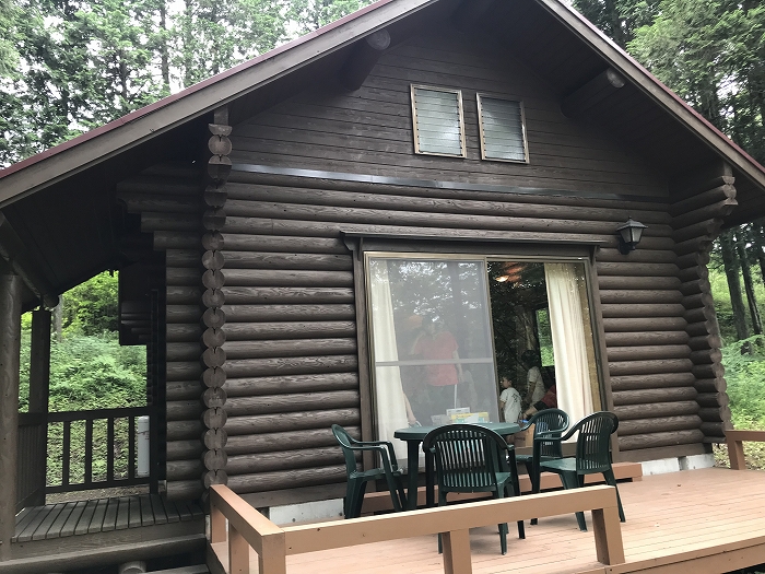 ここがみんなで泊まるログハウスです。わぁ、いいところだね!みんなのワクワクが止まりません。