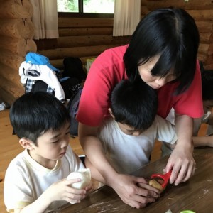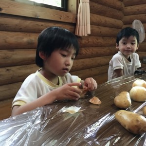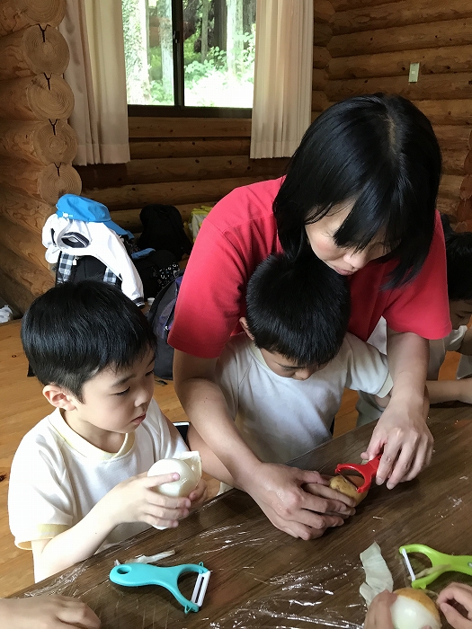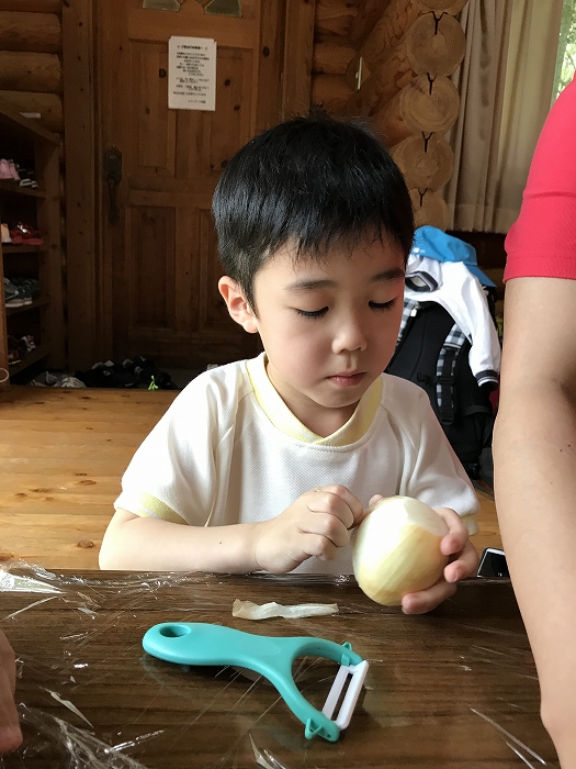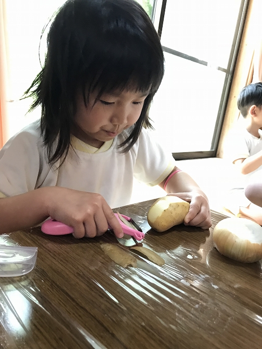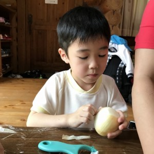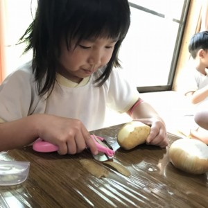 次は夕食のカレーの下ごしらえ。たまねぎ、じゃがいも、にんじんの皮むきです。