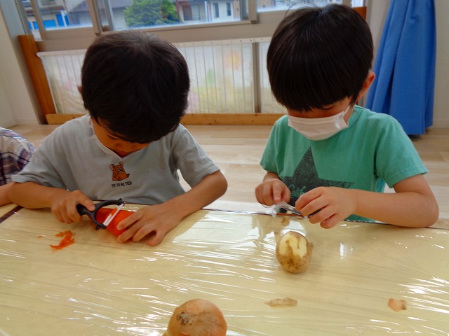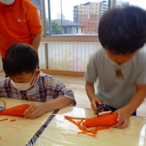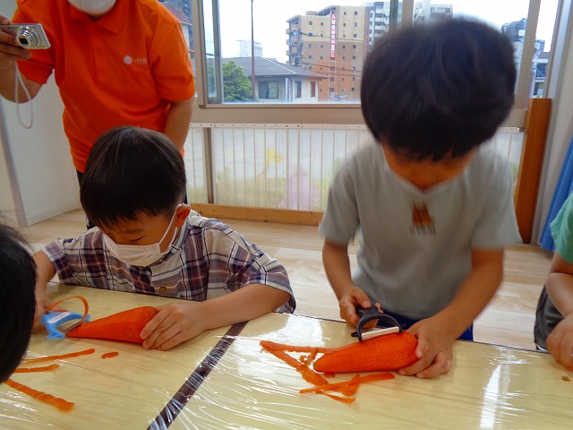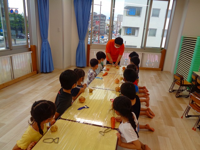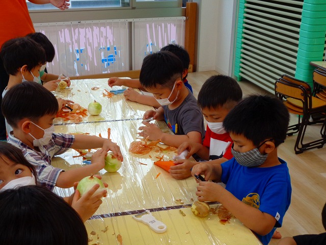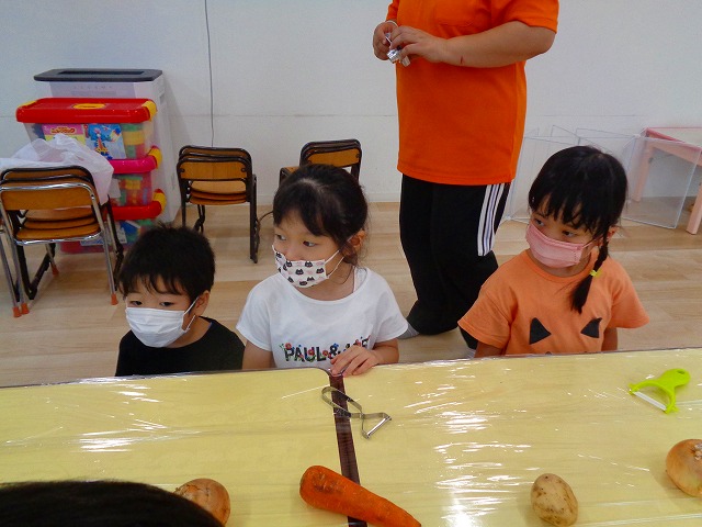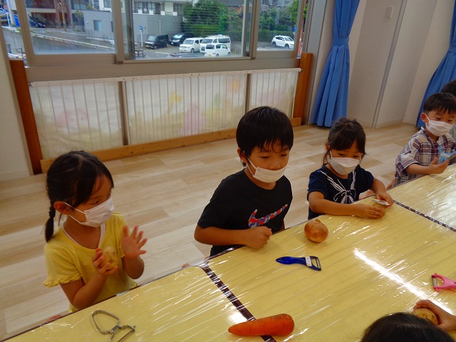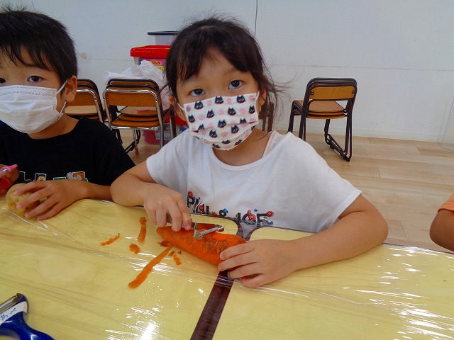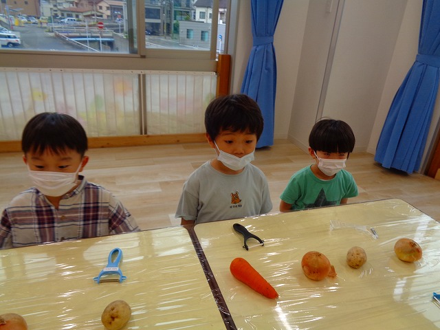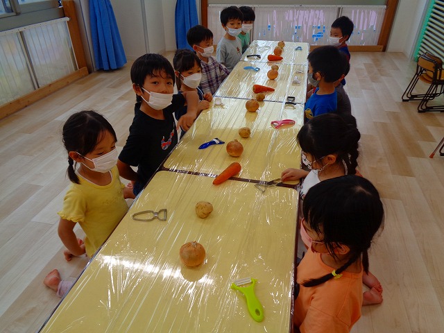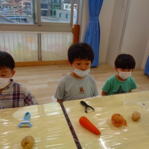 保育者と一緒にピーラーで皮をむいたり包丁で野菜を切りました。