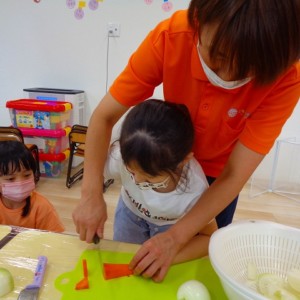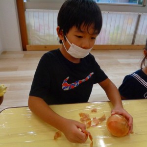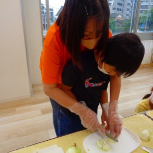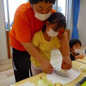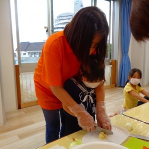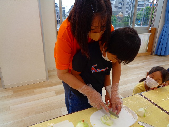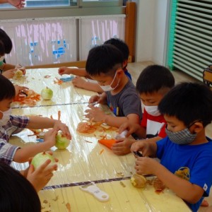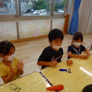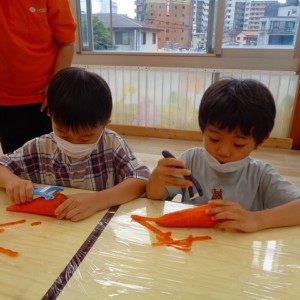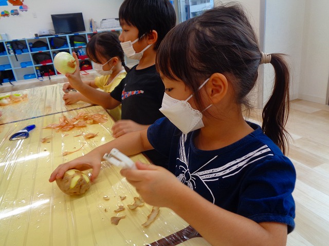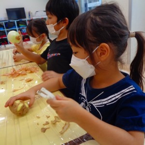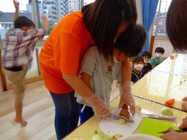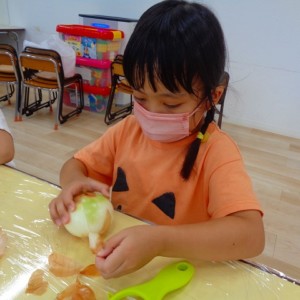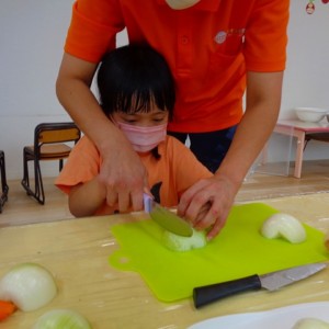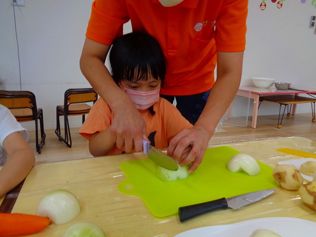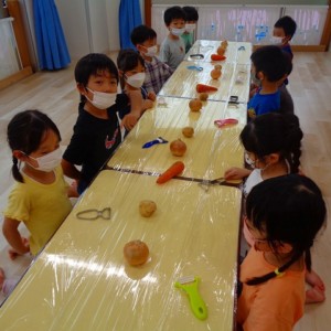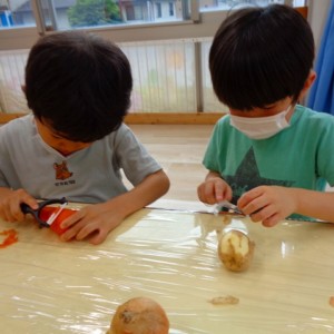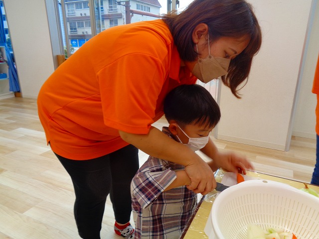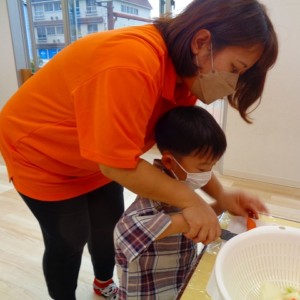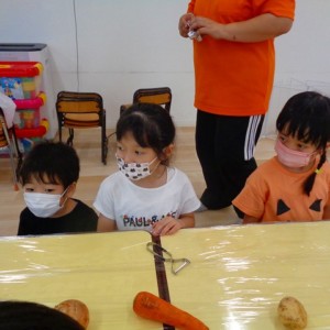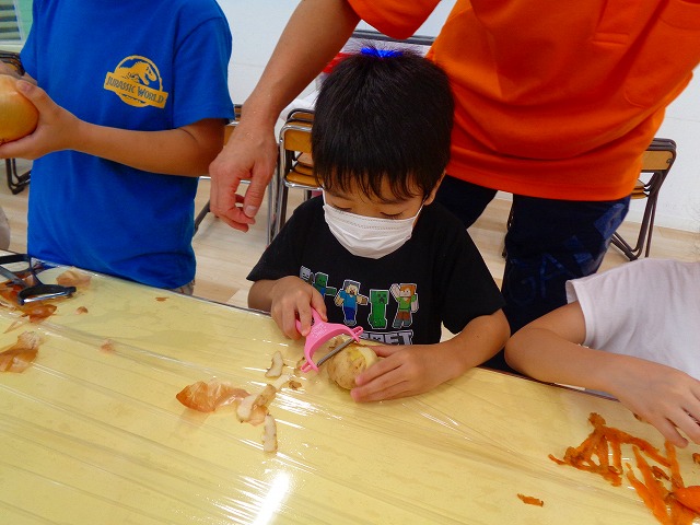 保育者と一緒にピーラーで皮をむいたり包丁で野菜を切りました。