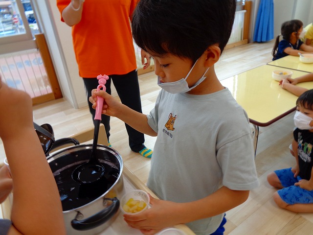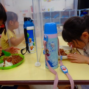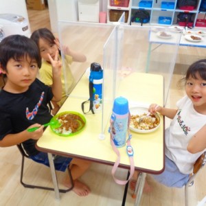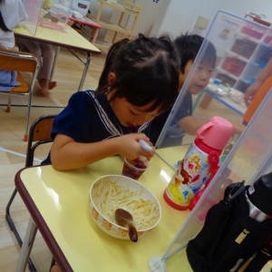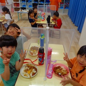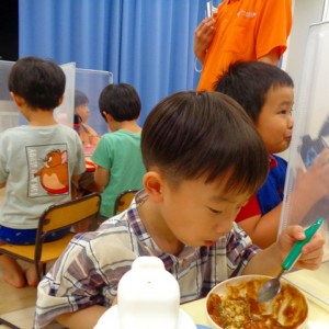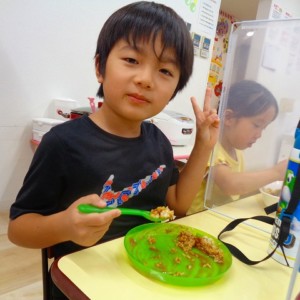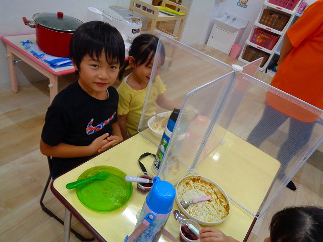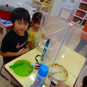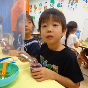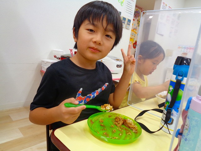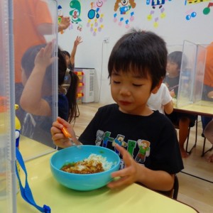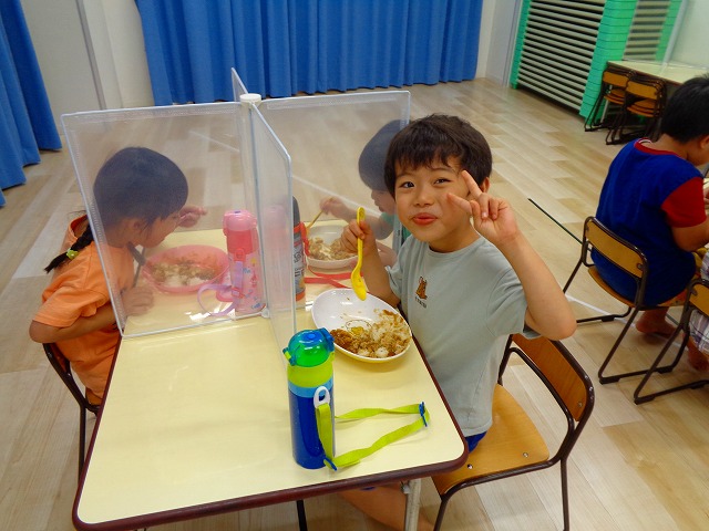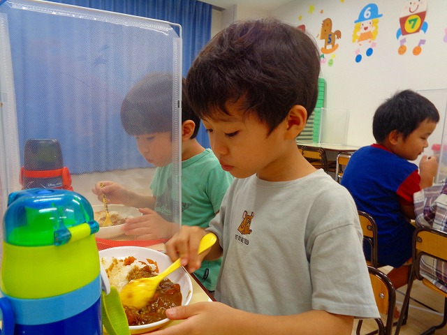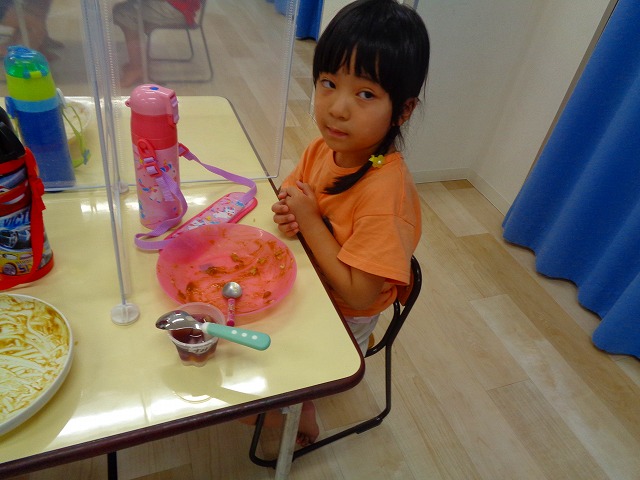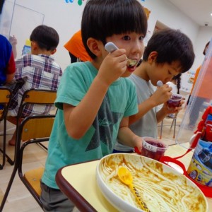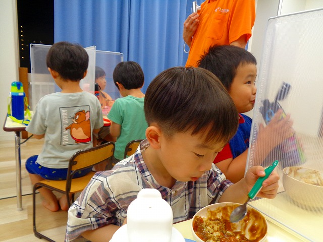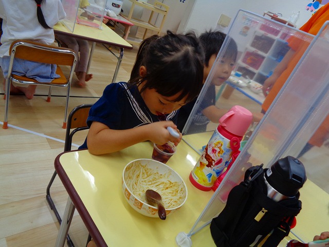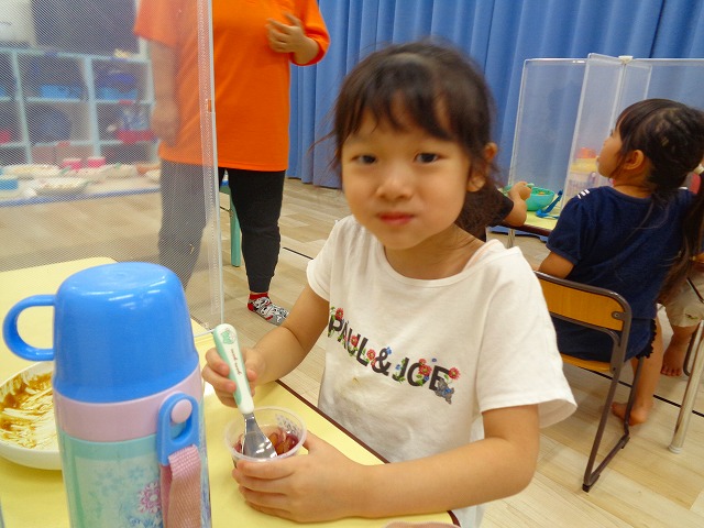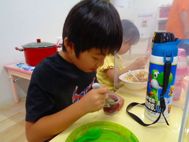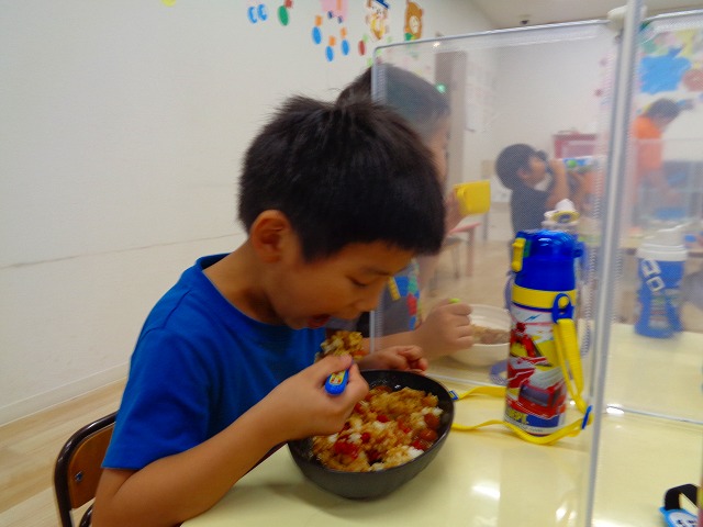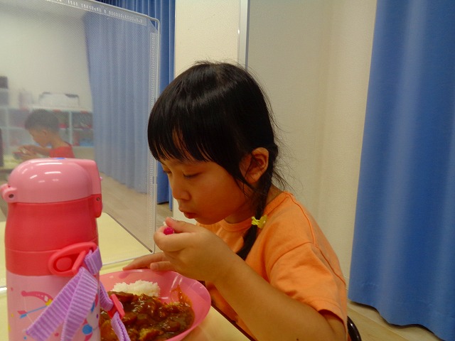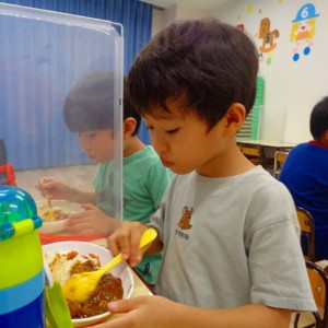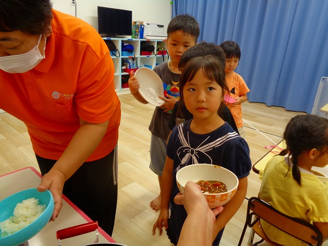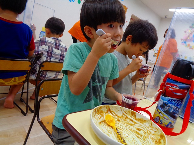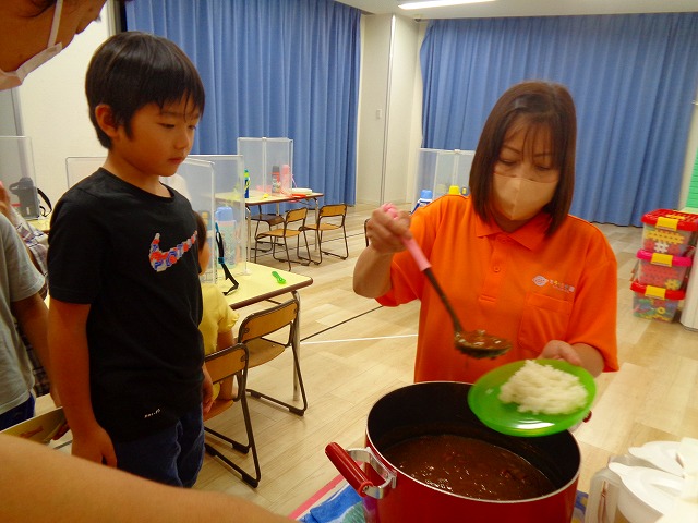 カレーやゼリーができあがり、みんなで“いただきます”をするとすぐにもりもり食べ始める子ども達。あっという間に完食し、“おかわりー”というお友だちが沢山いました。