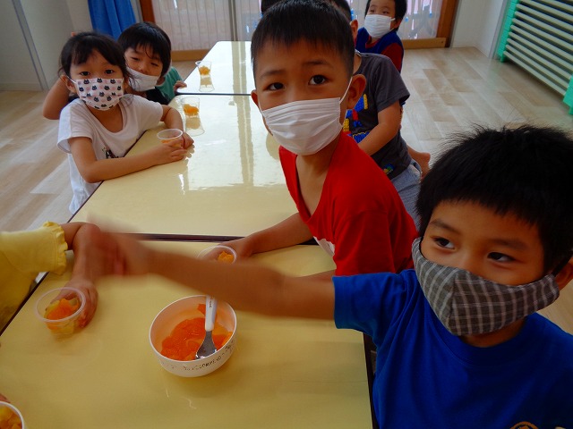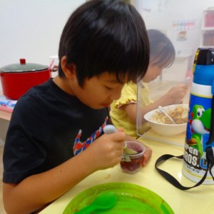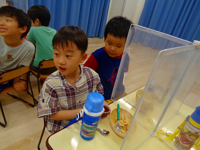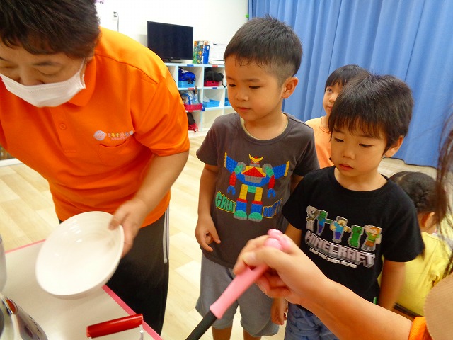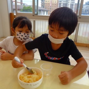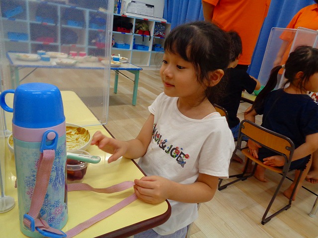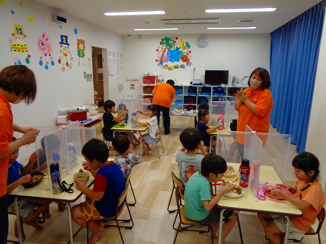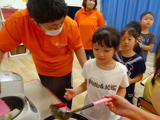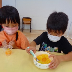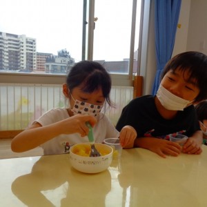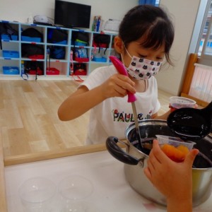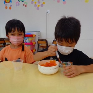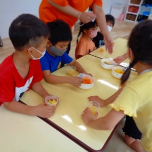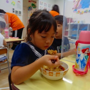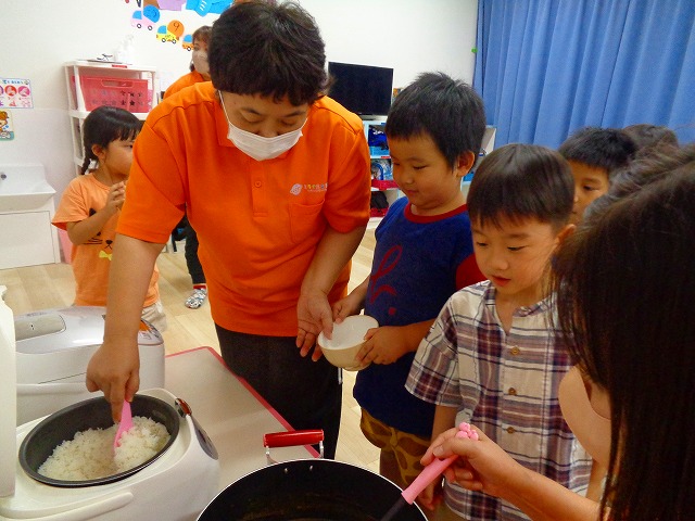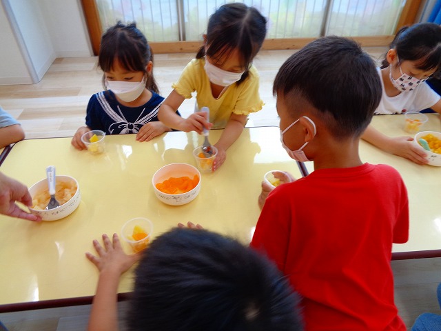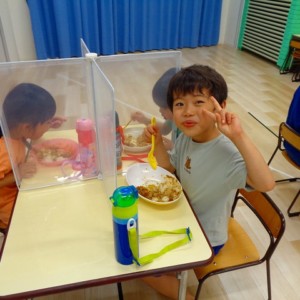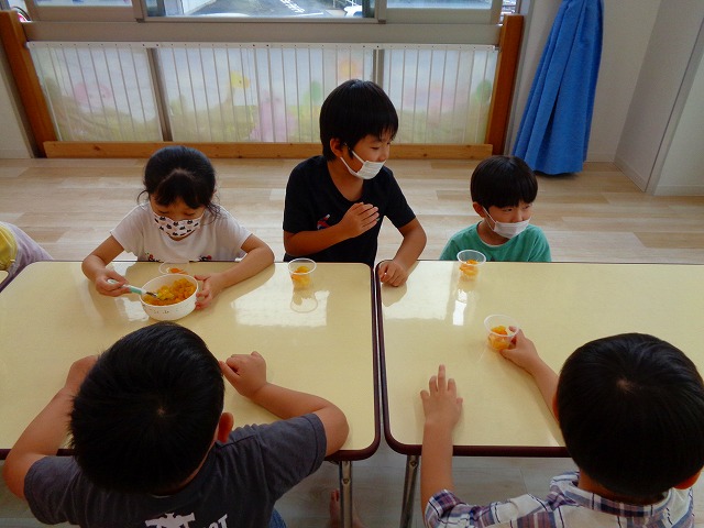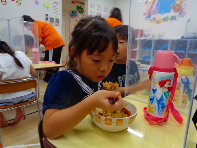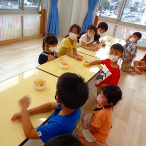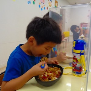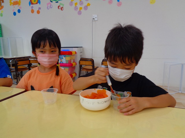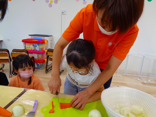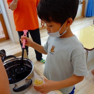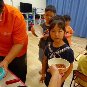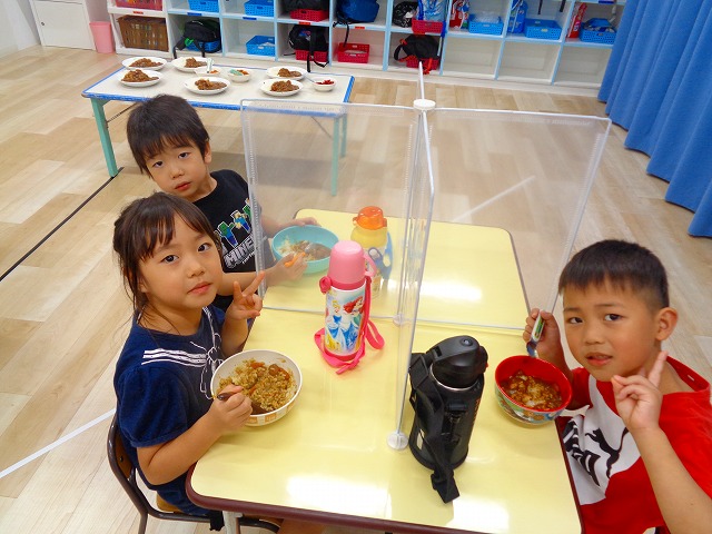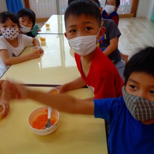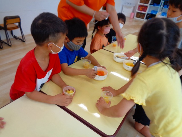 カレーやゼリーができあがり、みんなで“いただきます”をするとすぐにもりもり食べ始める子ども達。あっという間に完食し、“おかわりー”というお友だちが沢山いました。