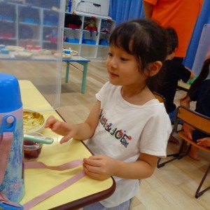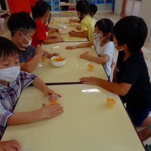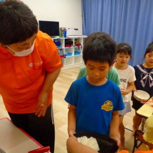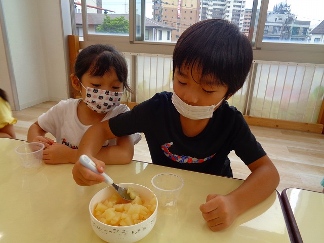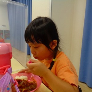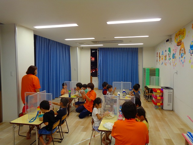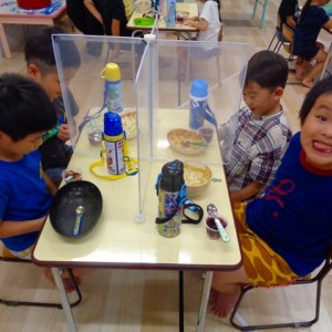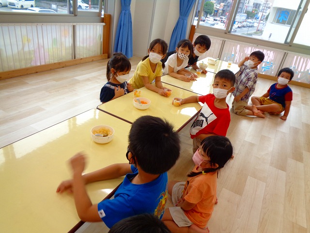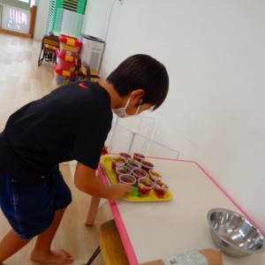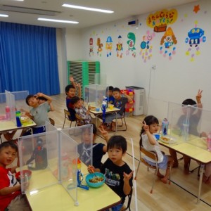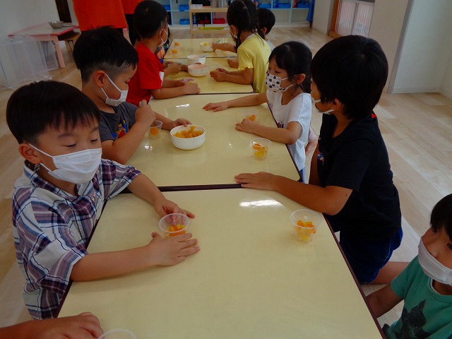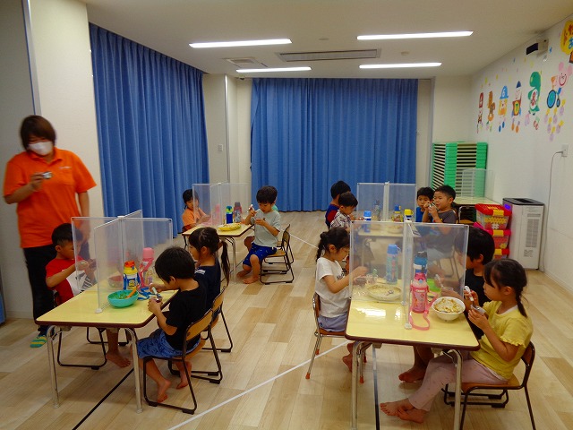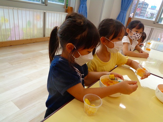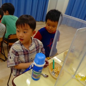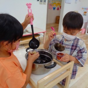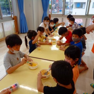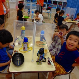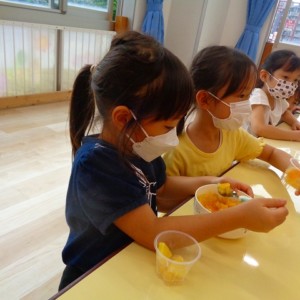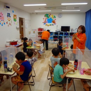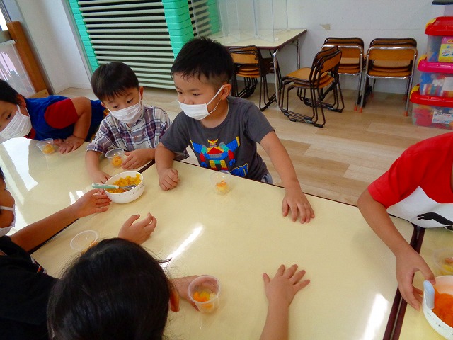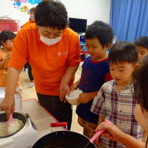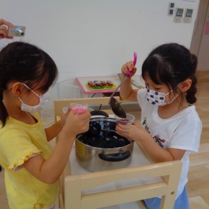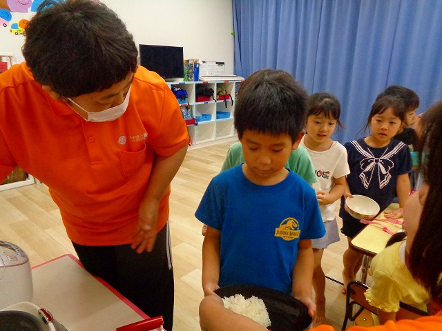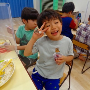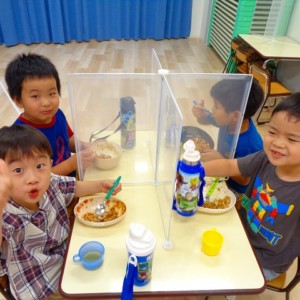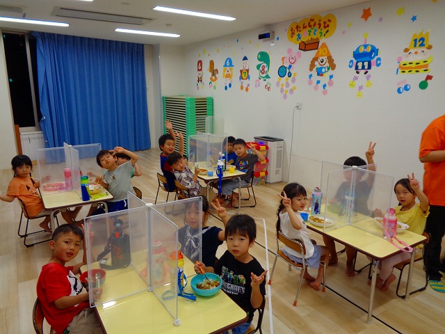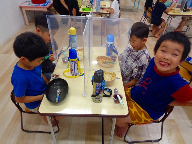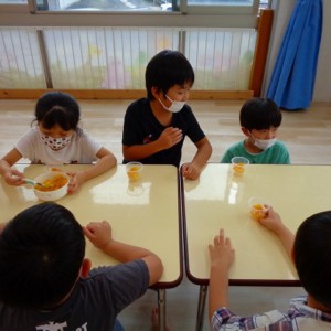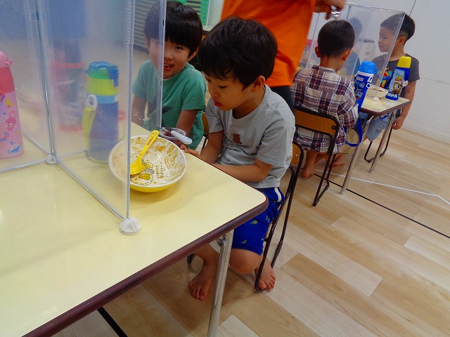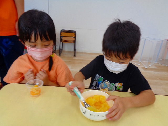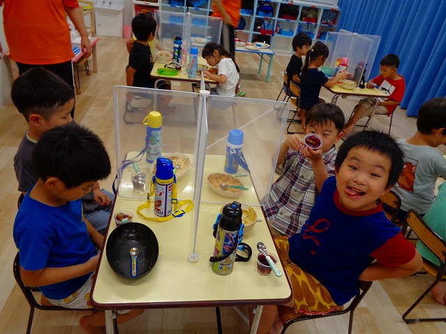 カレーやゼリーができあがり、みんなで“いただきます”をするとすぐにもりもり食べ始める子ども達。あっという間に完食し、“おかわりー”というお友だちが沢山いました。