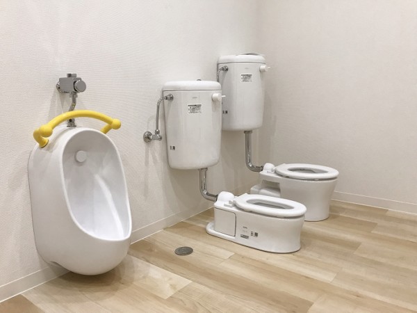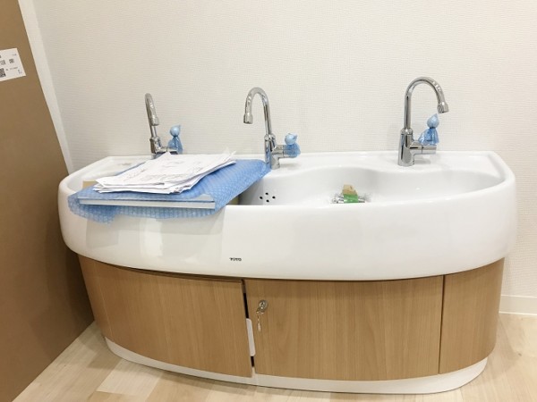 子供用のトイレも洗面台もかわいい、そして角ばっていない安全な設計になってます。シャワーまでついてる!