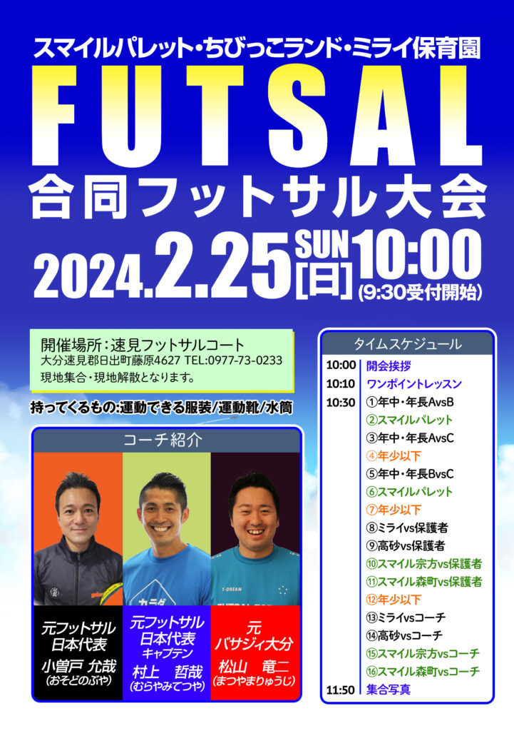 本イベントでは、弊社が運営する保育園(保育所ちびっこランド大分高砂園、ミライ保育園みなみおおいた)、および放課後等デイサービス(運動学習支援教室スマイルパレット大分宗方・森町)のフットサル教室において講師を委託しております、株式会社オービット小曽戸允哉氏(大分県フットサル連盟 副理事長)を招き、利用児童およびその保護者を対象に、フットサルイベントを開催致します。