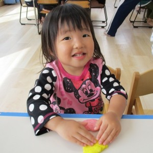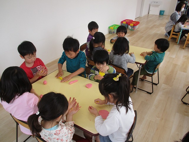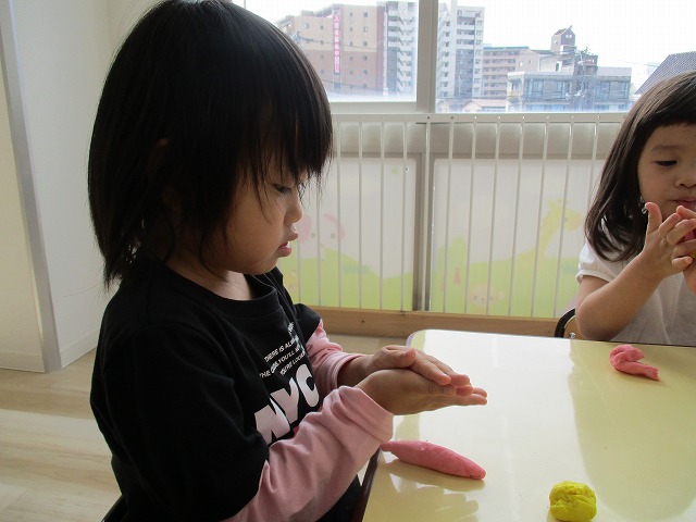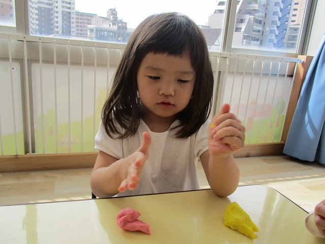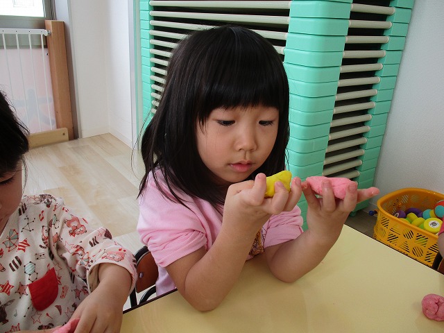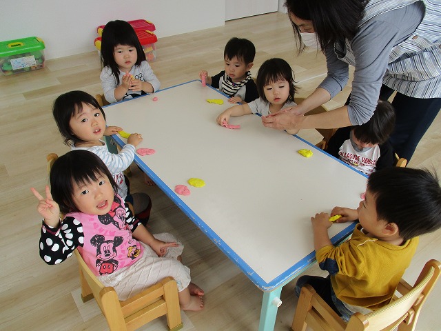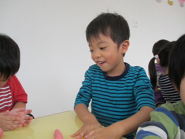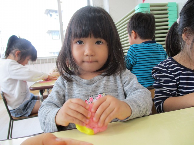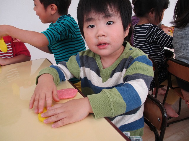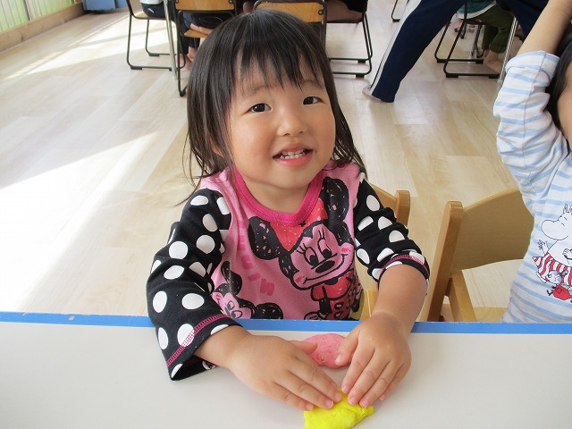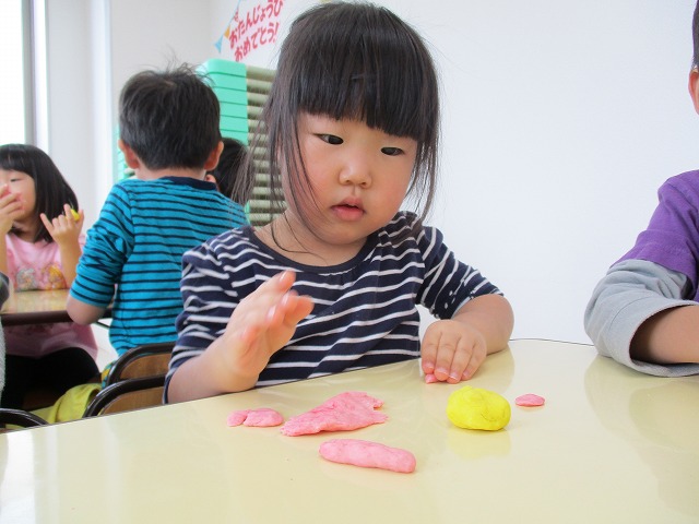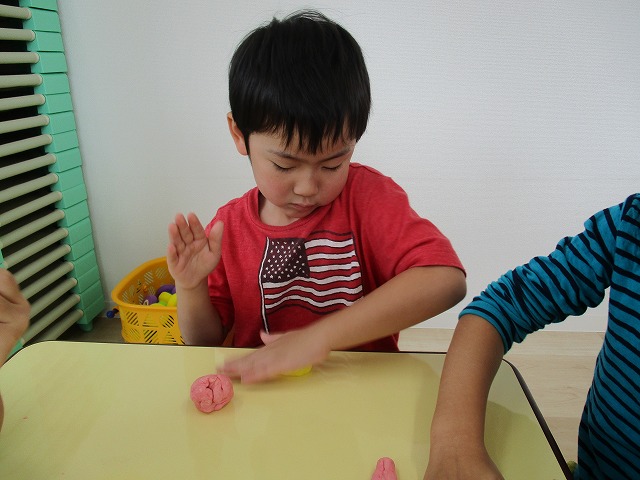 園で小麦粘土あそびをしました!小麦でできるので、小さいお友達も安心して遊べます。粘土あそびの魅力は、粘土のここちよい感触が心の安定につながることや、つぶす、たたくなど全身を使ってかかわることで気持ちを発散させられることです。また、自分の力加減ひとつで自在に形を変えられるので、ワクワクする面白さもあります。自分の働きかけで形が変わり、その結果が作品となることで自信にもつながります。指先を使っていろいろな感触を楽しむ経験は、脳の発達にとても大切です。