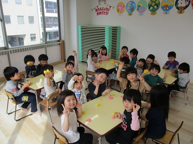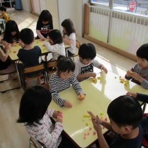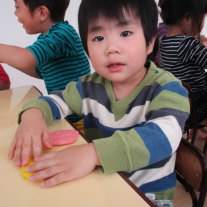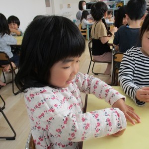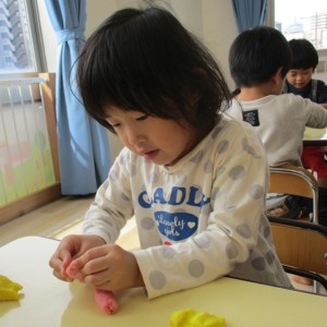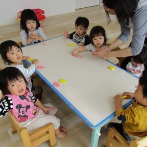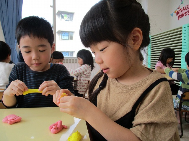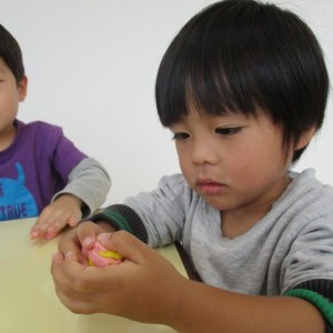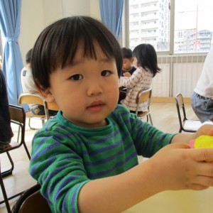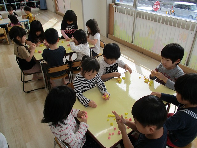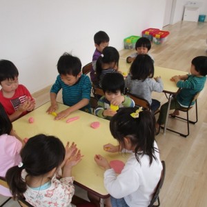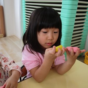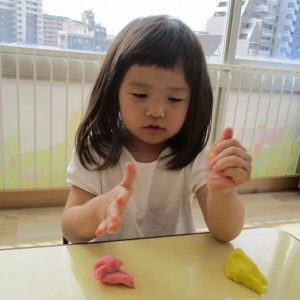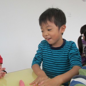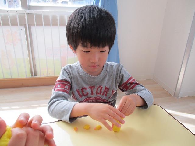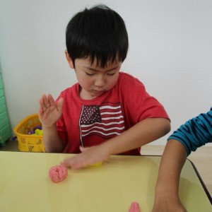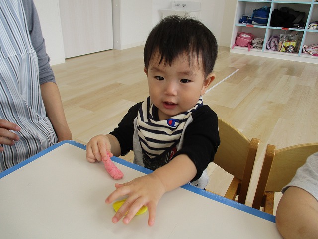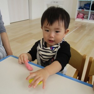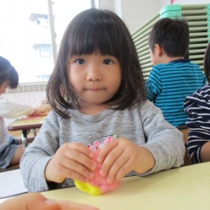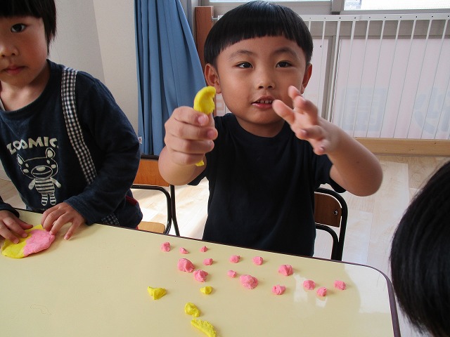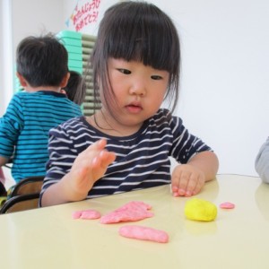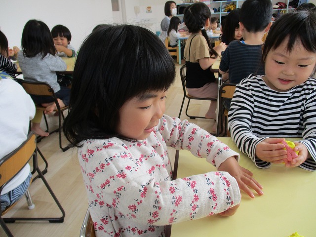 園で小麦粘土あそびをしました!小麦でできるので、小さいお友達も安心して遊べます。粘土あそびの魅力は、粘土のここちよい感触が心の安定につながることや、つぶす、たたくなど全身を使ってかかわることで気持ちを発散させられることです。また、自分の力加減ひとつで自在に形を変えられるので、ワクワクする面白さもあります。自分の働きかけで形が変わり、その結果が作品となることで自信にもつながります。指先を使っていろいろな感触を楽しむ経験は、脳の発達にとても大切です。