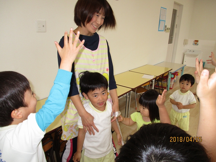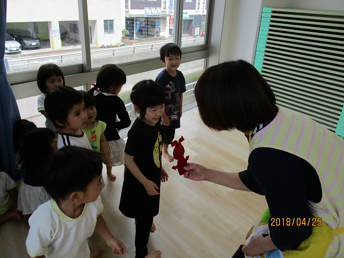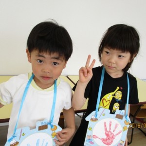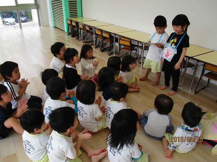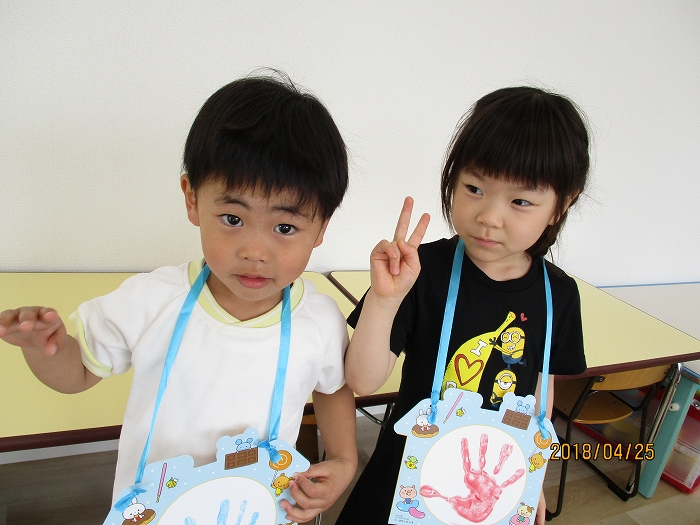 先日、4月生れのおともだちのお誕生日会を行いました。手形の入ったお誕生日カードをプレゼント。