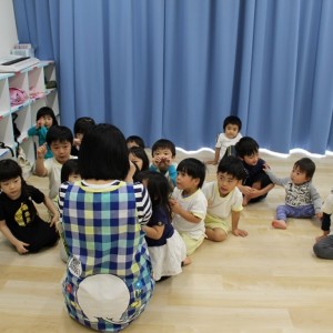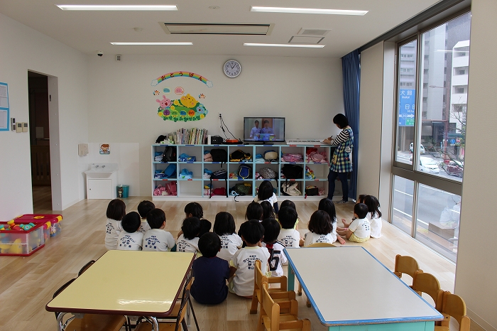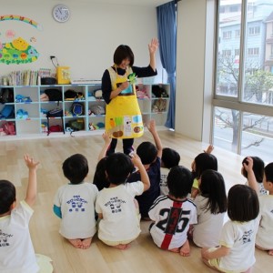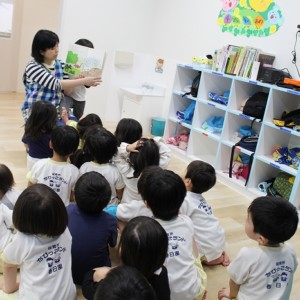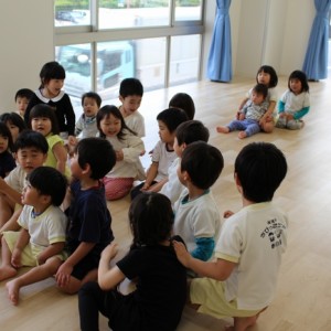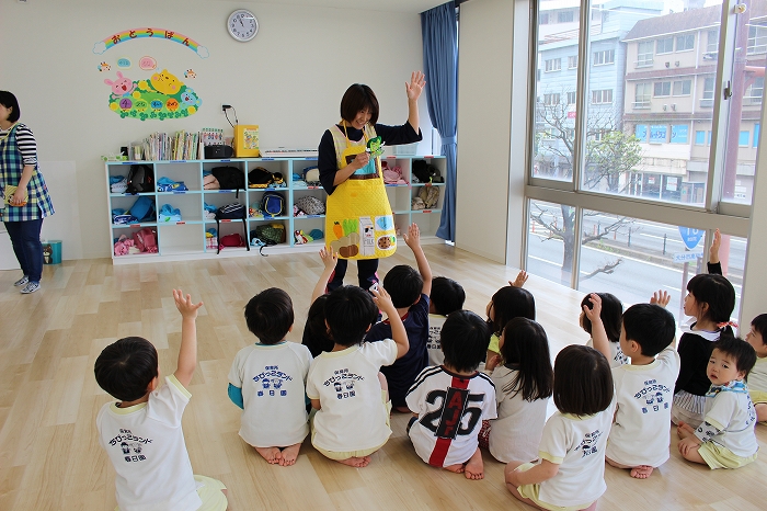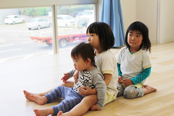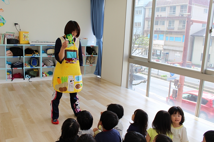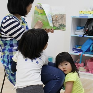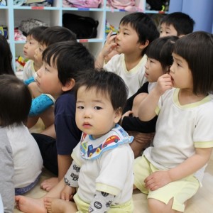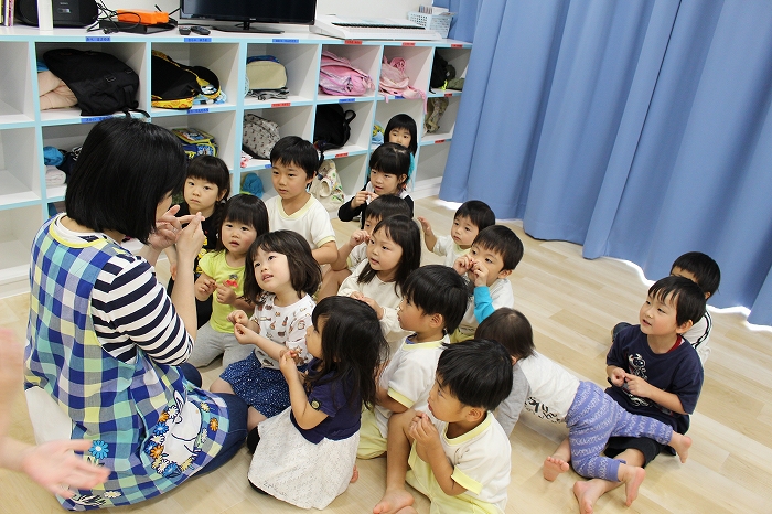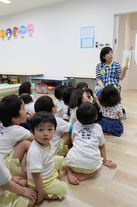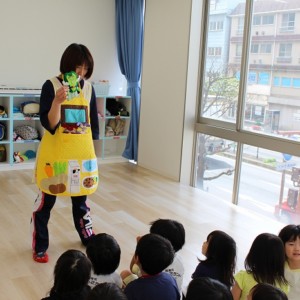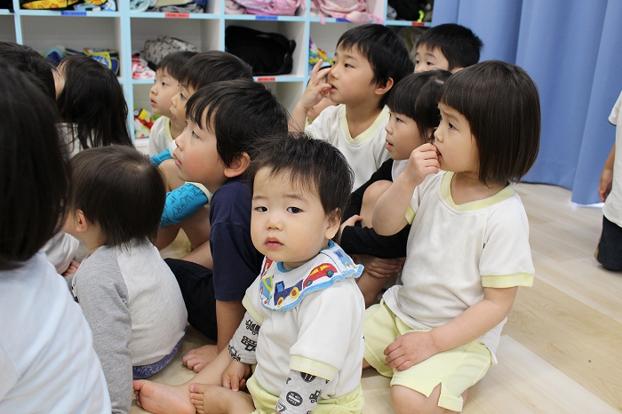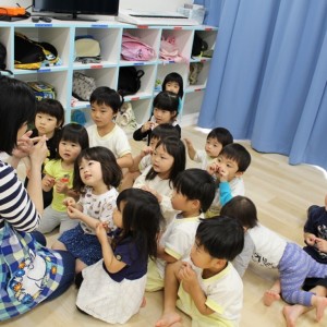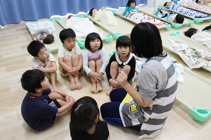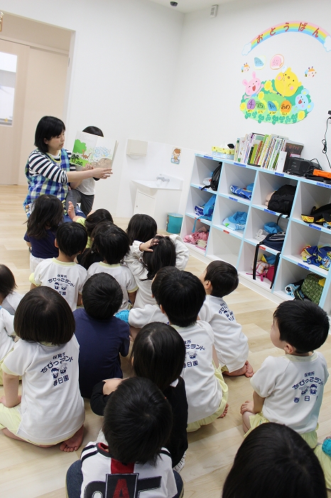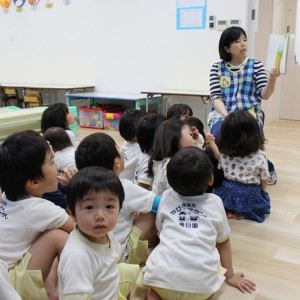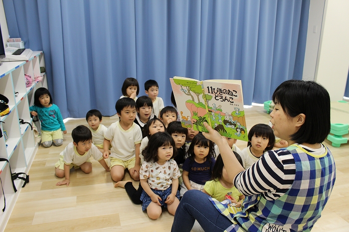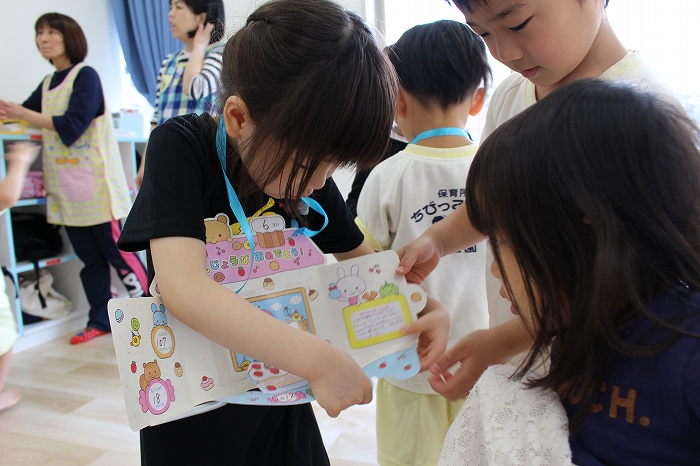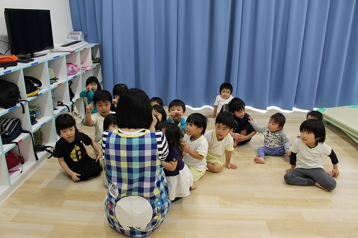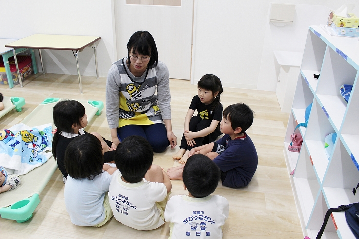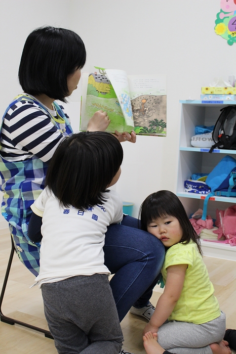 歯磨きとトイレをすませて、お昼寝前に先生が絵本を読んでくれました。