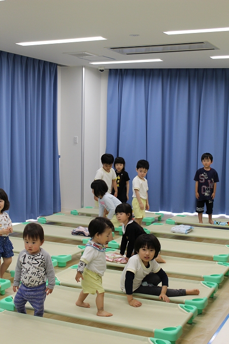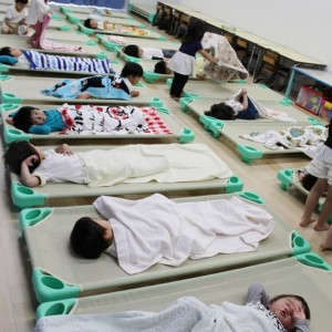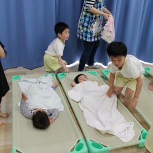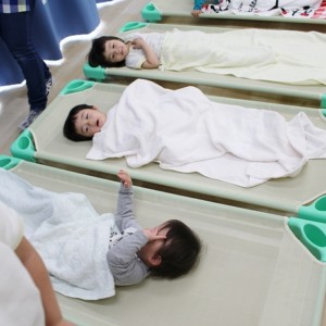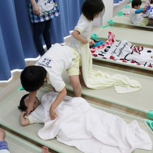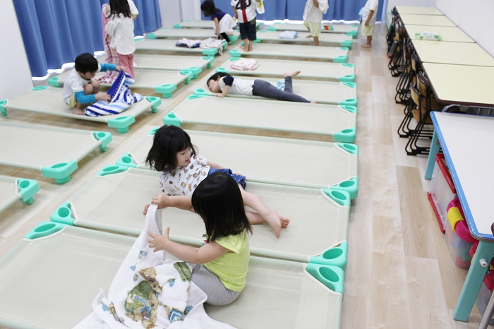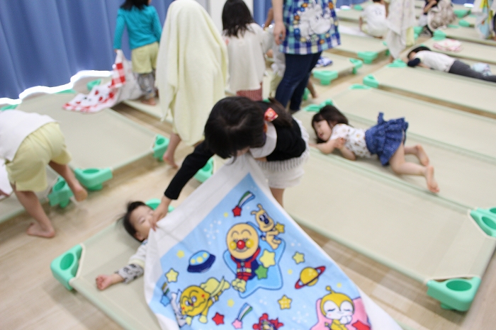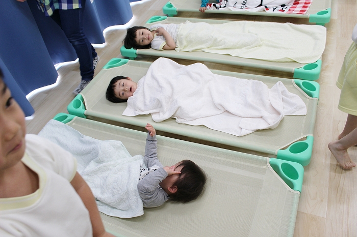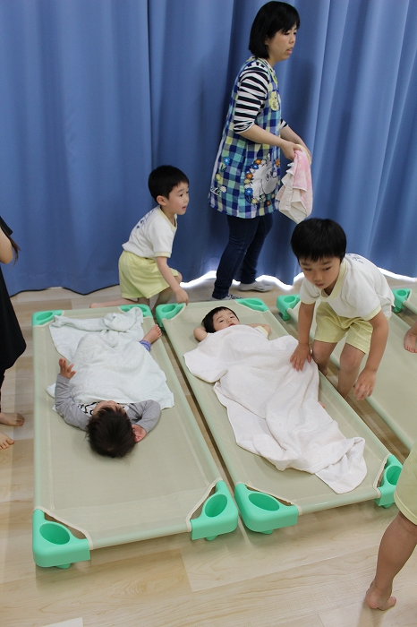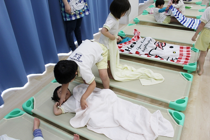 お昼寝。大きいおともだちは、小さいおともだちのタオルケットをかけてあげます。混合保育ならではの光景です。