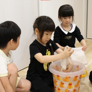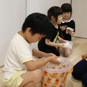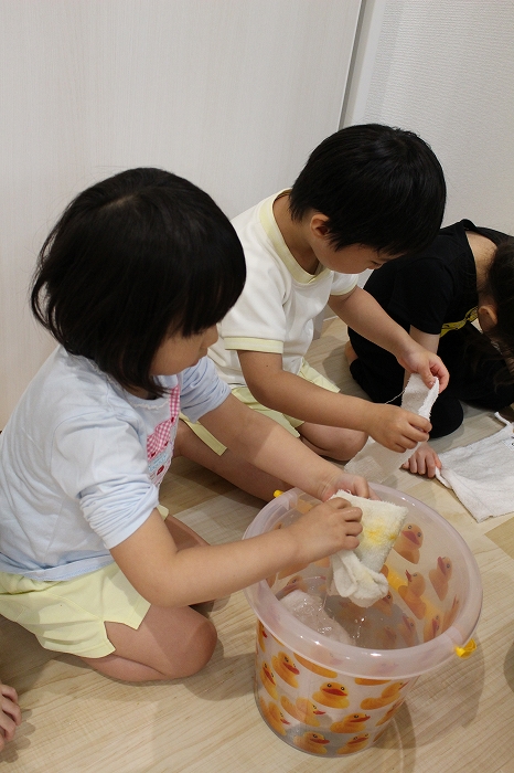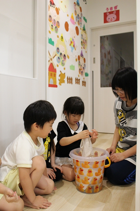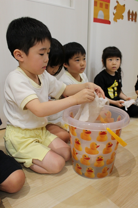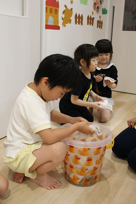その名も「ぞうきんの手しぼり特訓」小さいおててで上手に雑巾を絞っていました。
