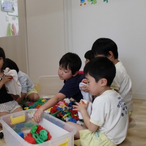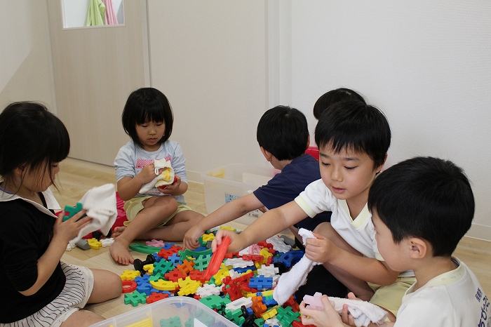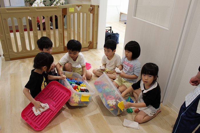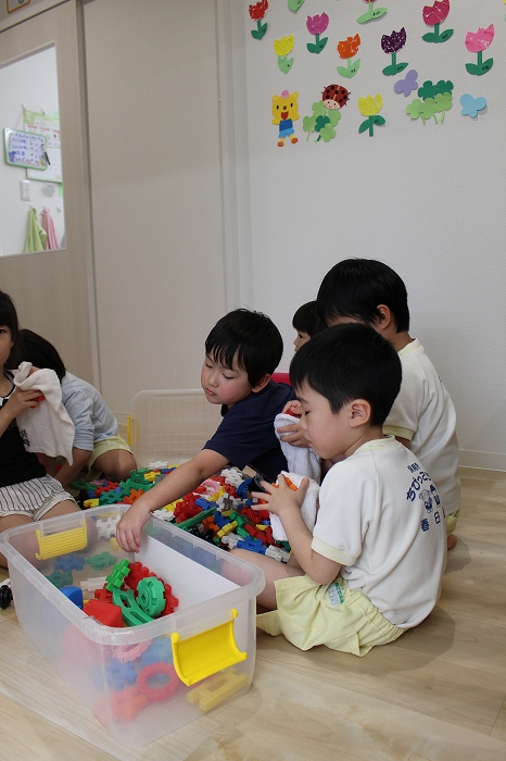 その後は、絞った雑巾でおもちゃの清掃をします。