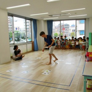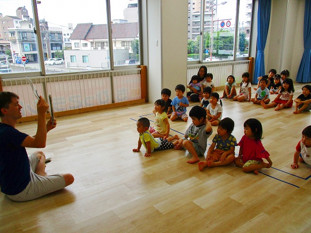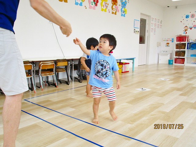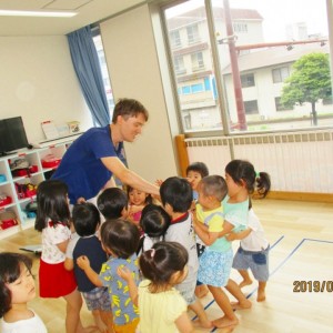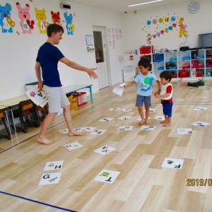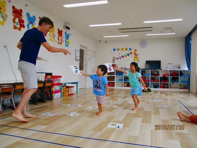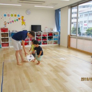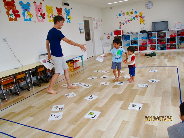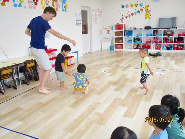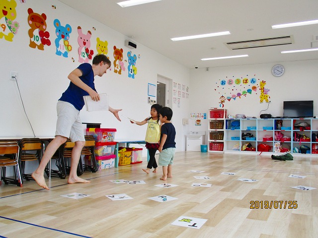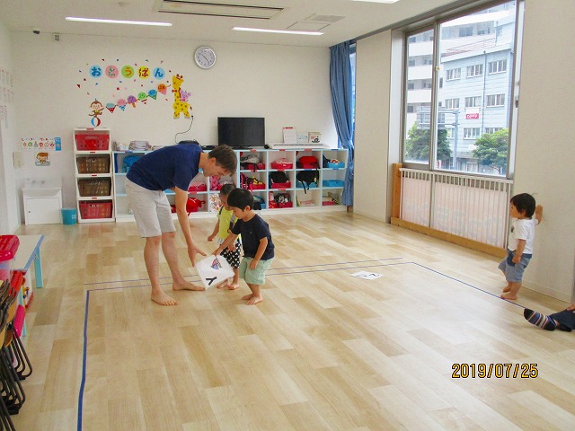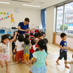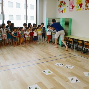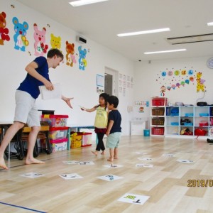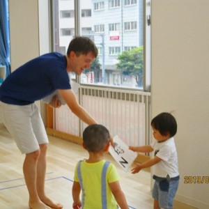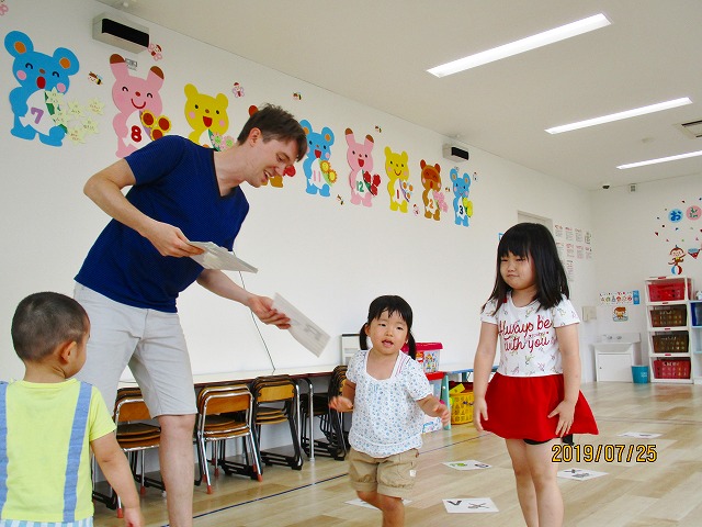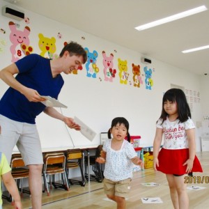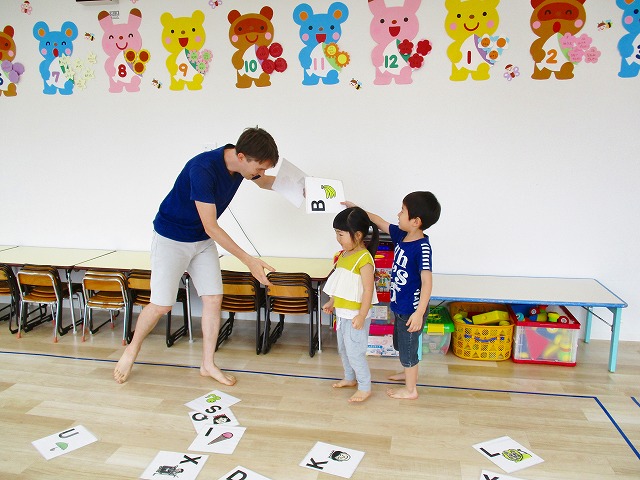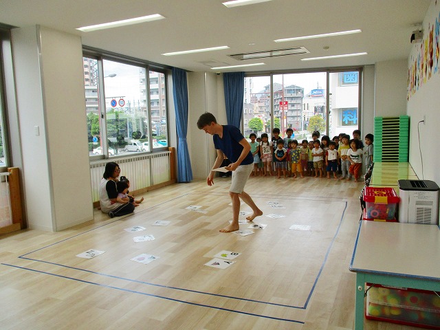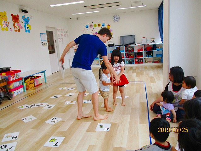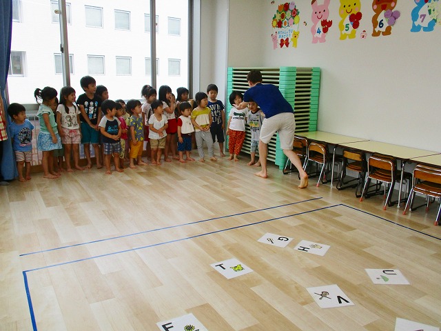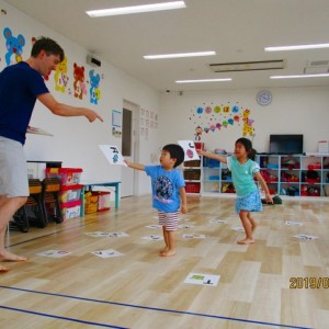 毎週、みんなが楽しみにしているデイビット先生の英会話♪ボールを使ったり、カードを使ったり、毎週いろいろな道具を使って、英単語を身近に感じれるよう丁寧に教えて下さってます♪そんなデイビット先生を子どもたちは大好きです。