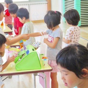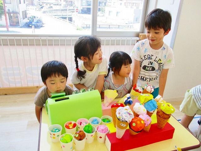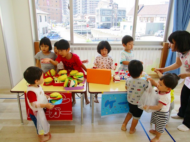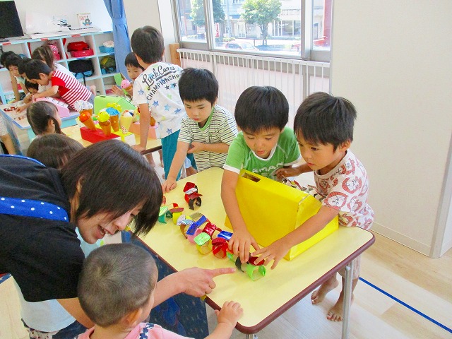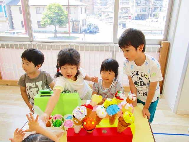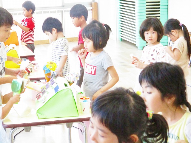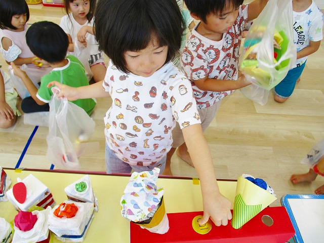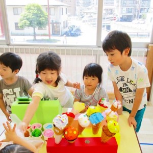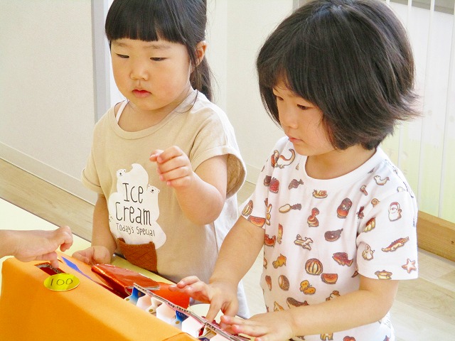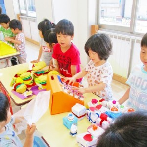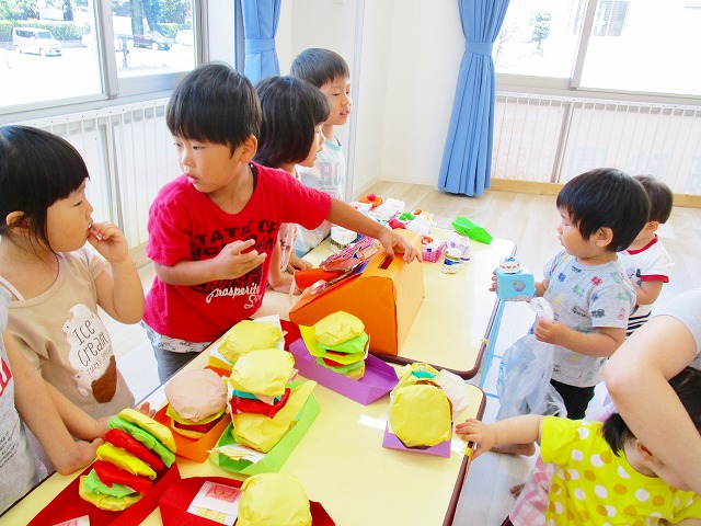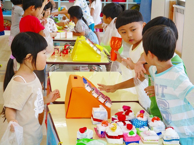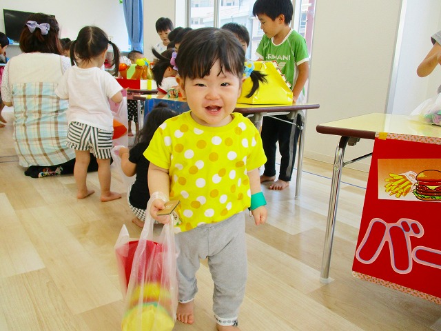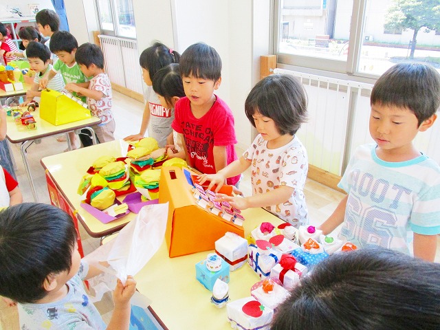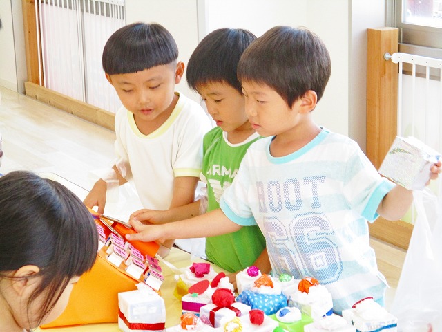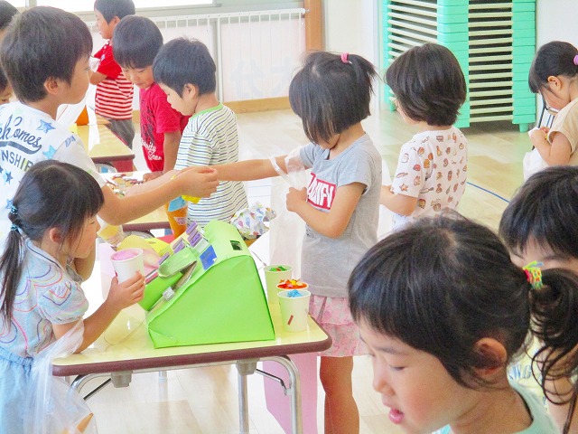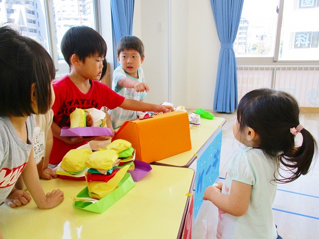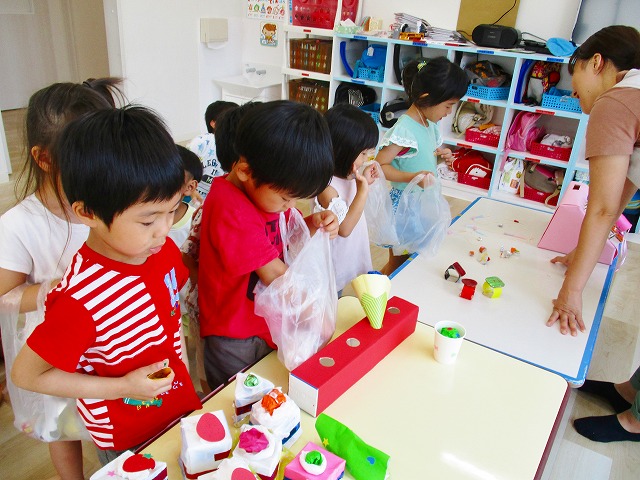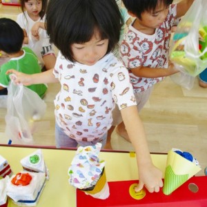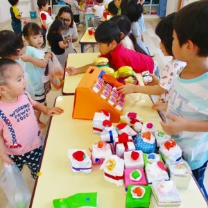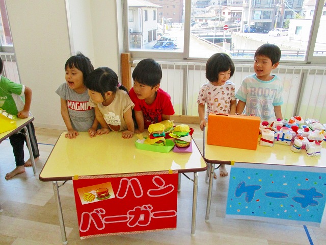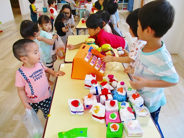 保育参観の時に、ぞうのお部屋でやった「お買い物ごっこ」を今度は、自分たちで商品をつくって、うさぎのお部屋のお友だちをご招待✨「いらっしゃいませ!!」元気いっぱいの店員さんたちに、小さいお友だちは、ちょっとびっくりしちゃってましたが、嬉しそうにお買い物してくれましたよ!!