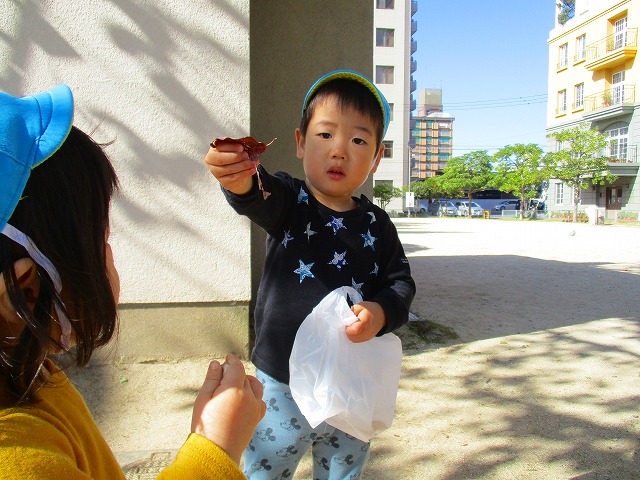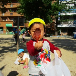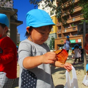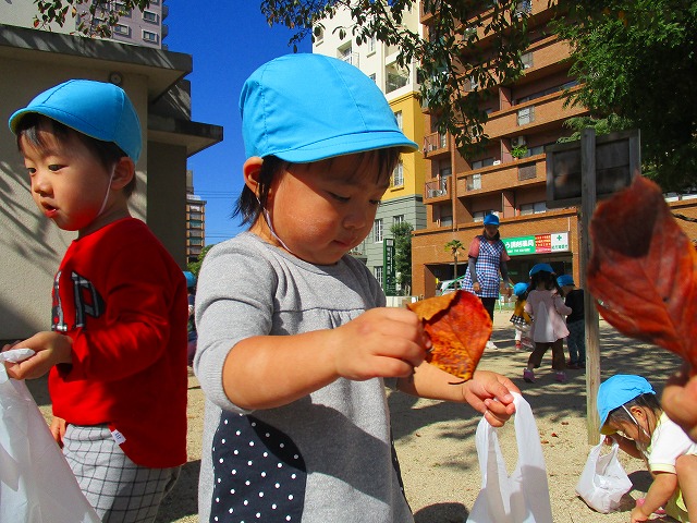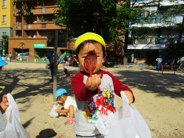 製作で使う葉っぱを探しに公園へ ♫ 「見て~♪これキレイ✨」「大きい葉っぱ見つけたよ~♪」など、目をキラキラさせながらたくさん葉っぱを集めてくれました!!!さてどんな作品が出来るかなぁ~楽しみです(^^♪