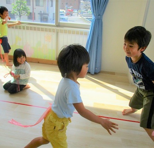 ちょっと空いた時間にしっぽとりゲーム♬ 大きいお友だちは、お友だちのお尻をじっと見つめて・・・真剣勝負!!!しっぽを持ちながら逃げたり、一瞬で取られて...