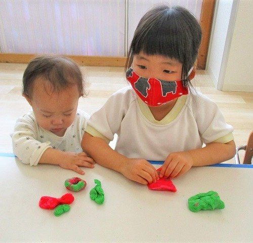 小麦粘土遊びをしました💖 感触を楽しみながら思い思いにコネコネ・・・🎵 夢中になって小さくちぎったり、重ね合わせたり ...