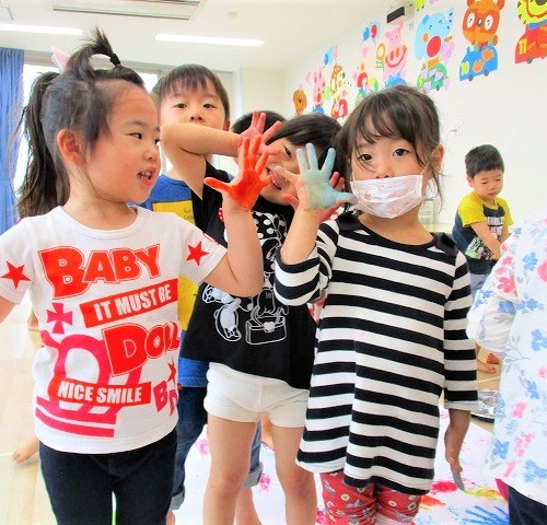 久しぶりの絵の具遊び🎶 先生が準備している姿が見えると何するのだろうと興味津々の子どもたち・・💖 好きな色の絵の具を手...