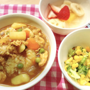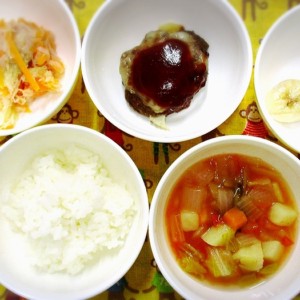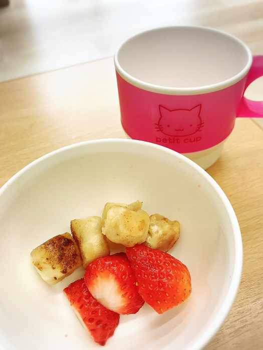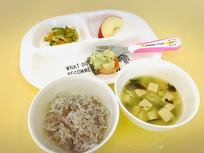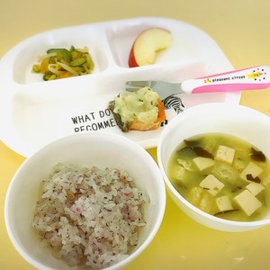 おやつは10時と3時、延長保育の方には夕方にもおやつがあります。保護者の方には一か月分の献立と、使用している食材と調味料、栄養価の数値を記載した一覧表をお渡ししています。食器も一つ一つの茶碗、お皿をご用意し、お茶碗を手にもって食べる習慣をつけます。アレルギーをお持ちのお子様への配慮も致します。卵・乳製品・落花生・ソバ等アレルギーをお持ちのお子様は入園の際に症状等詳しいお話をさせていただきながら対応させていただきます。